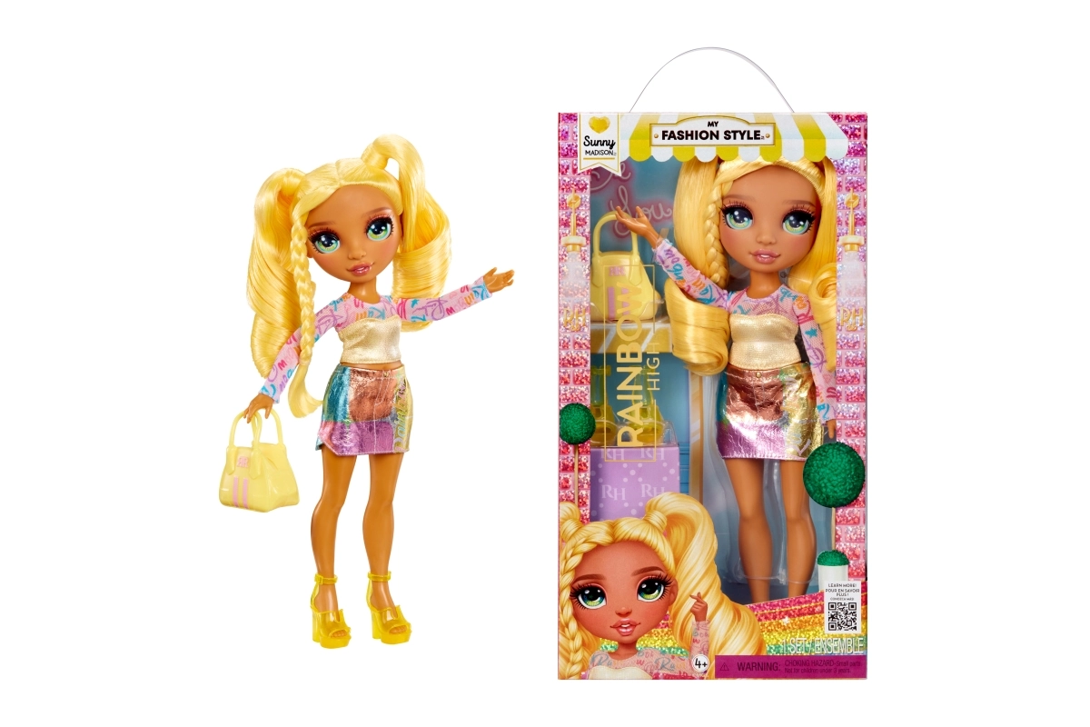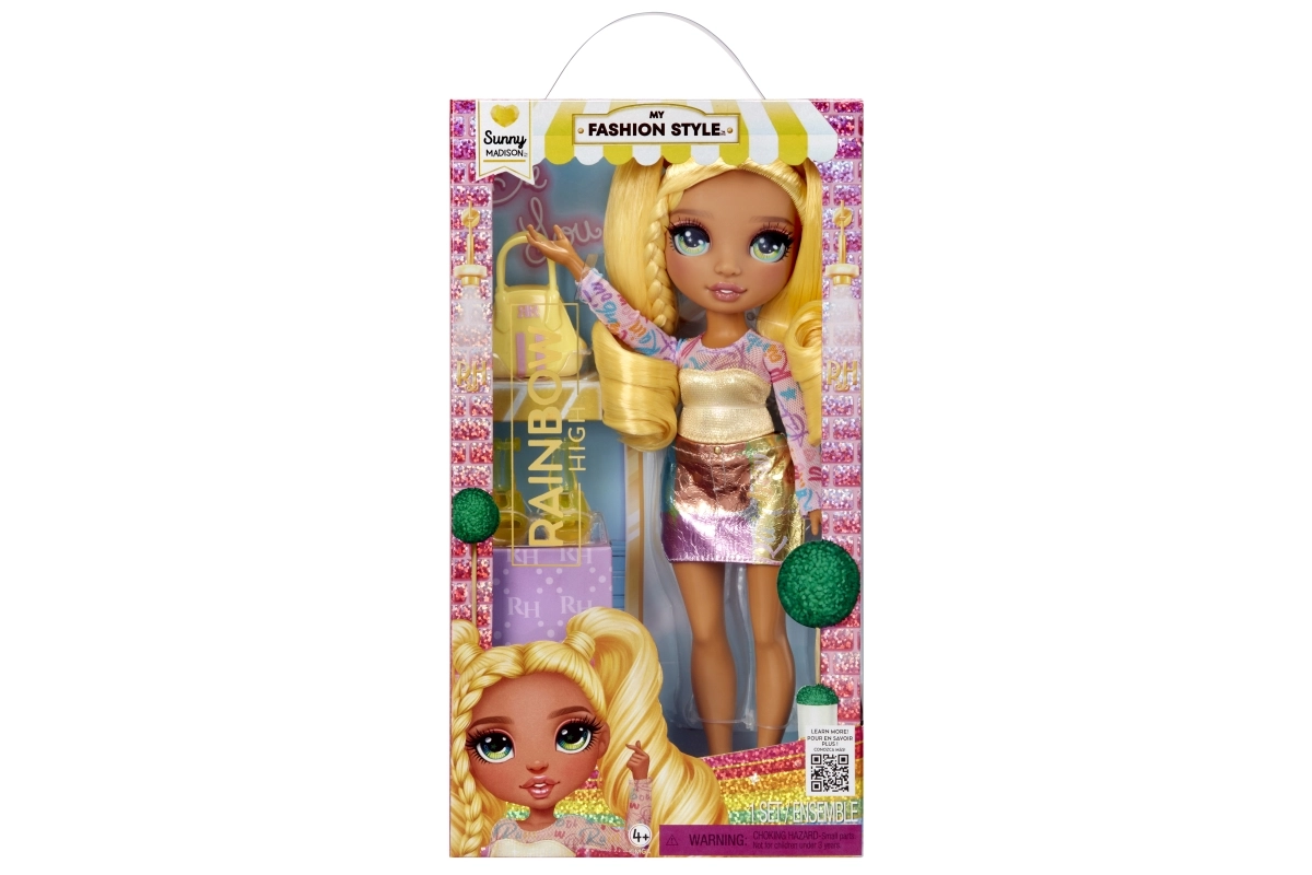 Запознайте се с куклата Sunny от колекцията Rainbow High Fashion Style – икона на стила, която сияе от глава до пети. Тя има дълга лесна за разресване жълта коса, детайлни стъклени очи и фини мигли. В комплекта са включени стилни елементи за тоалет, съчетани обувки и чанта. Благодарение на ставите за лесно позициониране е идеална за стайлинг, разиграване на истории и събиране. Възраст 3+.