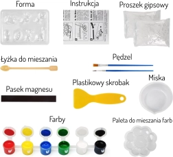 - Всичко в комплекта: форми, гипс, купичка, лъжичка, палитра, 6 бои, четка, шпатула, инструкция