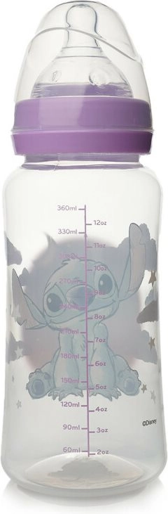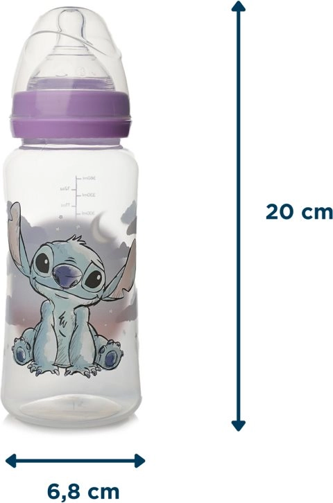 Практично бебешко шише с мотив Lilo и Stitch с обем 360 мл, проектирано за удобно хранене на новородени. Силиконовата биберона подпомага естественото сукане, а антиколиковата система намалява риска от газове и дискомфорт. Шишето е без BPA и отговаря на строгия стандарт EN 14350.