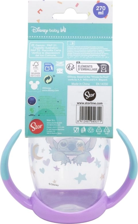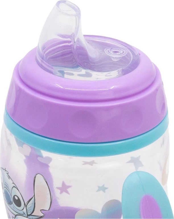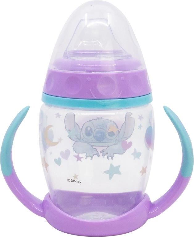 Чашката с дръжки и силиконов накрайник STITCH 270 мл помага на децата удобно и безопасно да преминат от шише към чашка. Мекият накрайник е щадящ към чувствителните венци и зъбки, а противоплъзгащите дръжки осигуряват сигурен захват дори за малки ръчички.