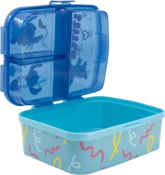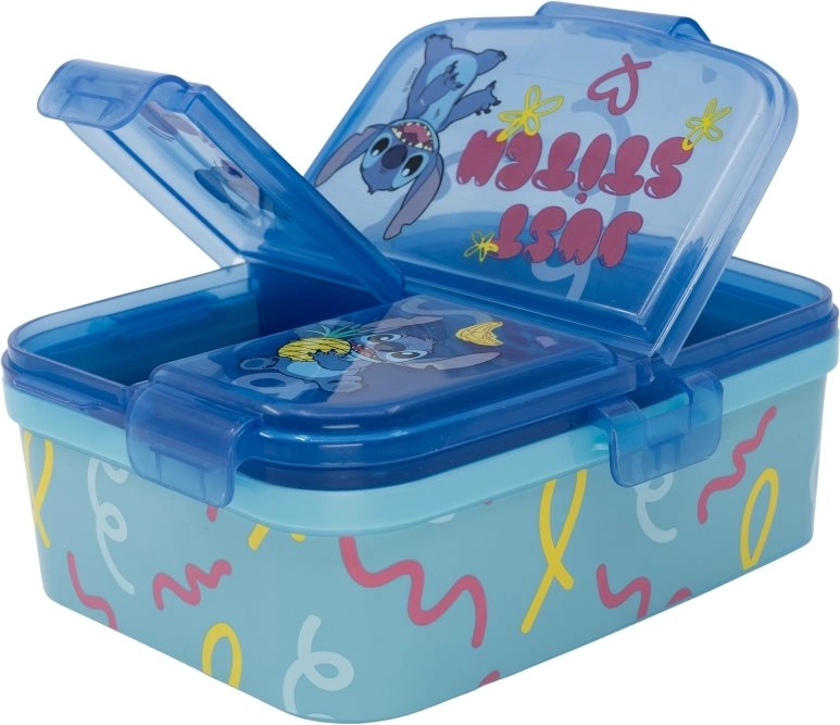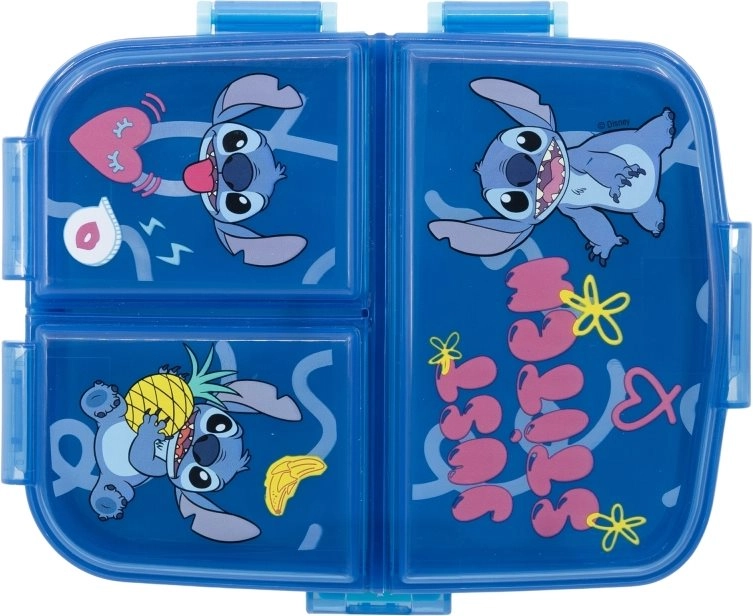 Стилна и практична кутия за храна с мотив STITCH, предлагаща 1 голямо и 2 малки отделения за прегледно разделяне на храната. Изработена е от издръжлив материал и не съдържа BPA – идеална за училище, детската площадка и излети.