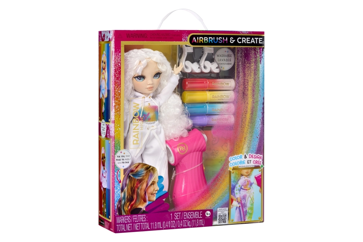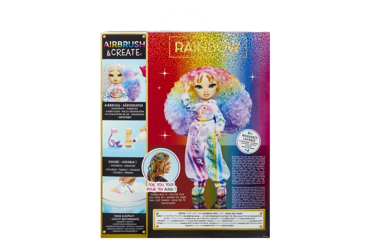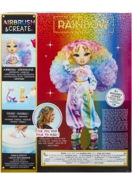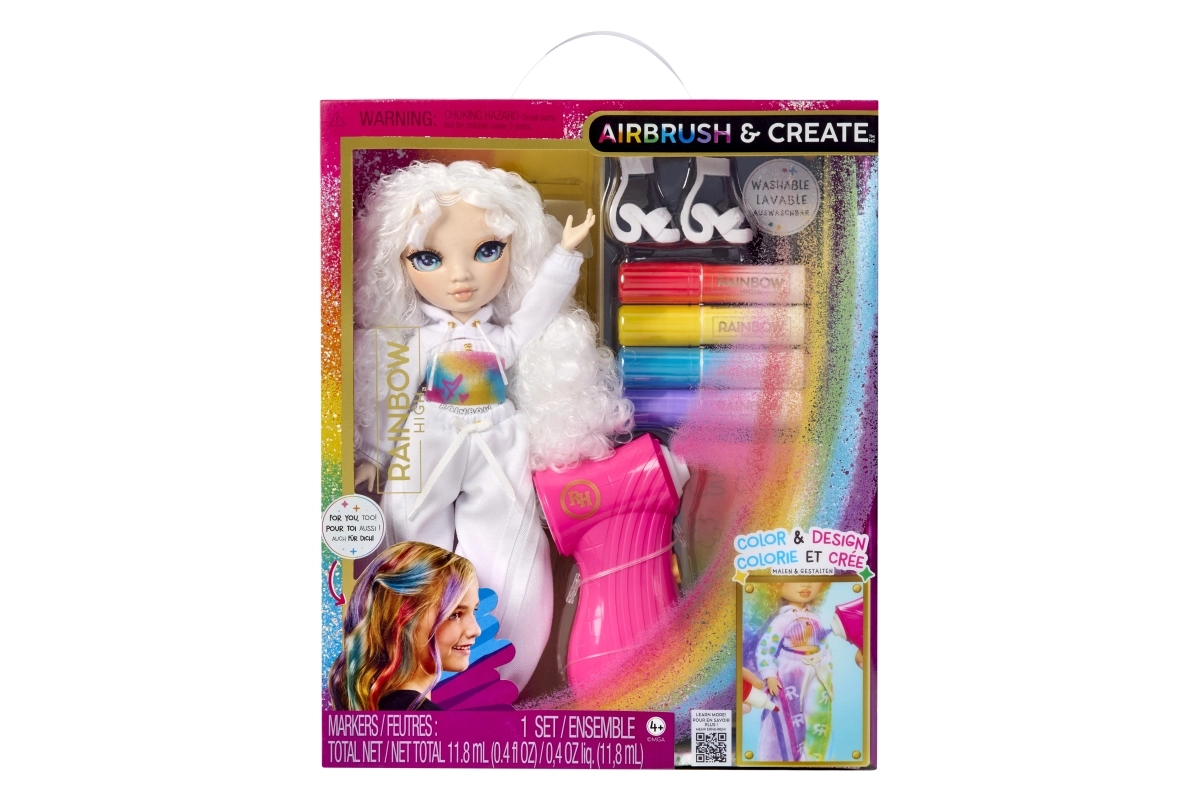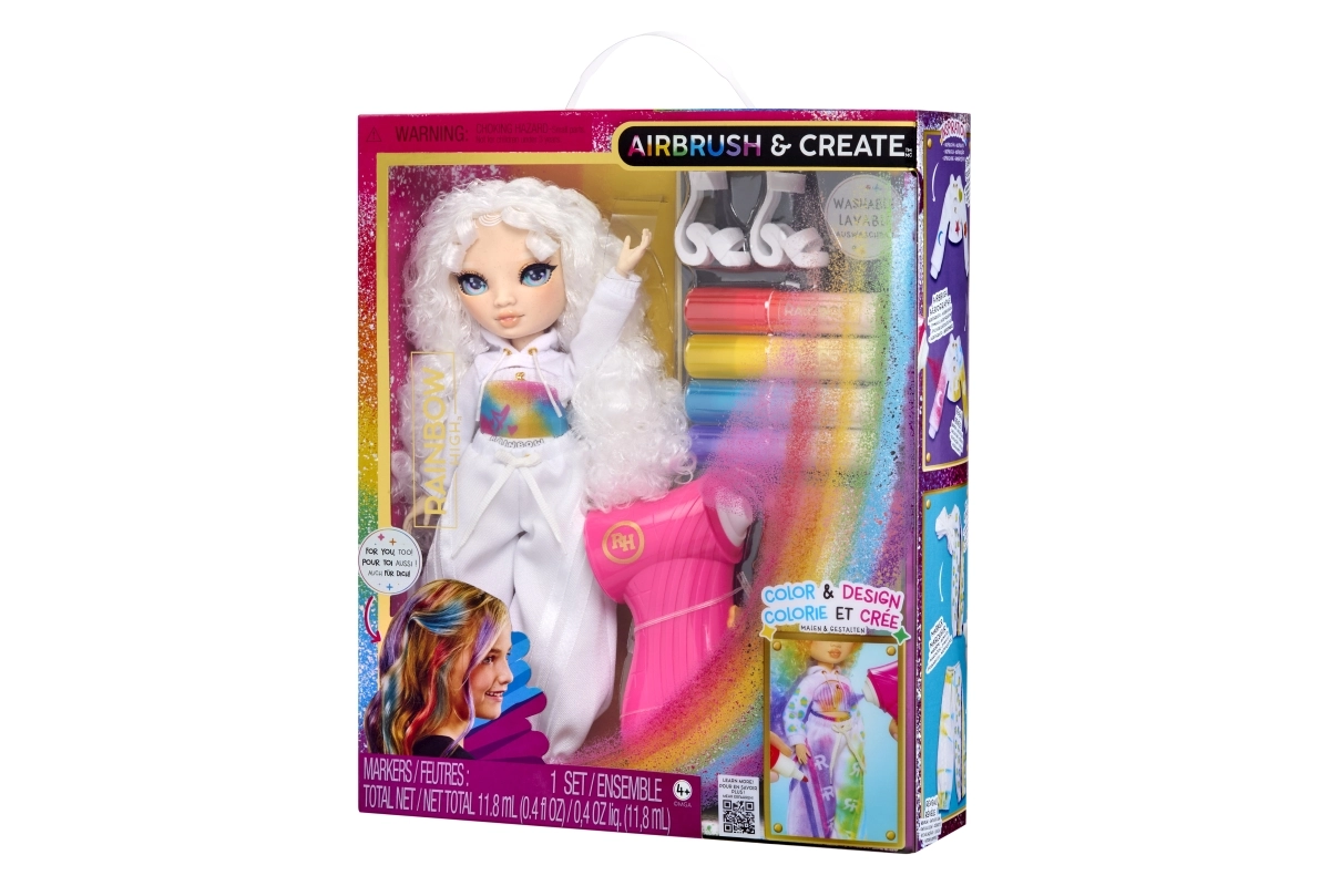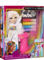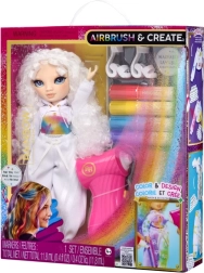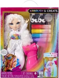 Тази креативна кукла е като празно платно – изцяло в бяло, с бяла коса и тоалет, готови за вашето въображение. В комплекта ще откриете четири миещи се дъгови флумастера (червен, жълт, син, лилав) и практичен airbrush за лесно преливане и равномерно нанасяне на цвета.