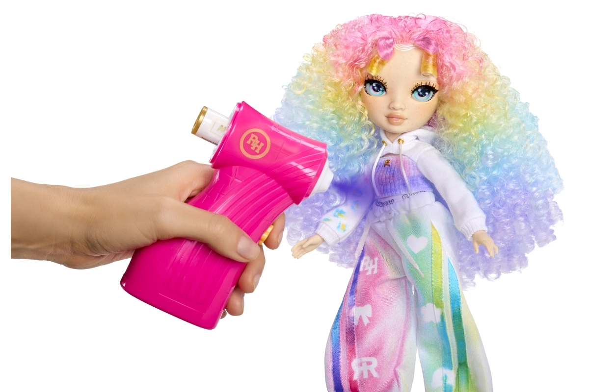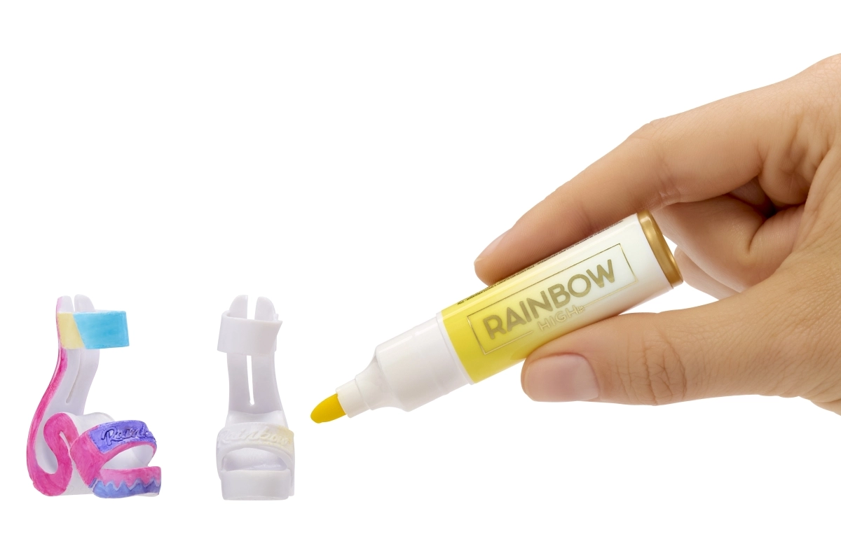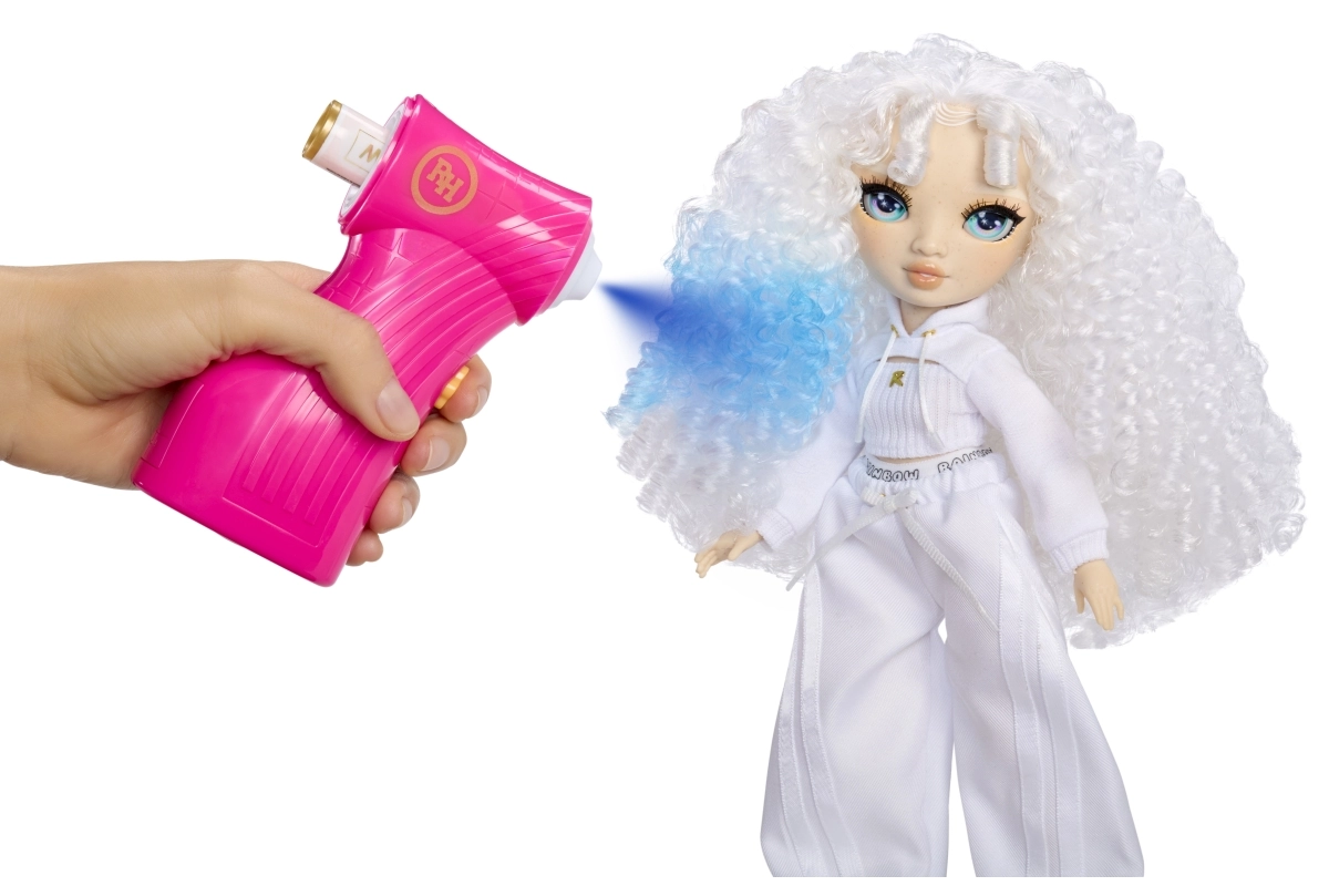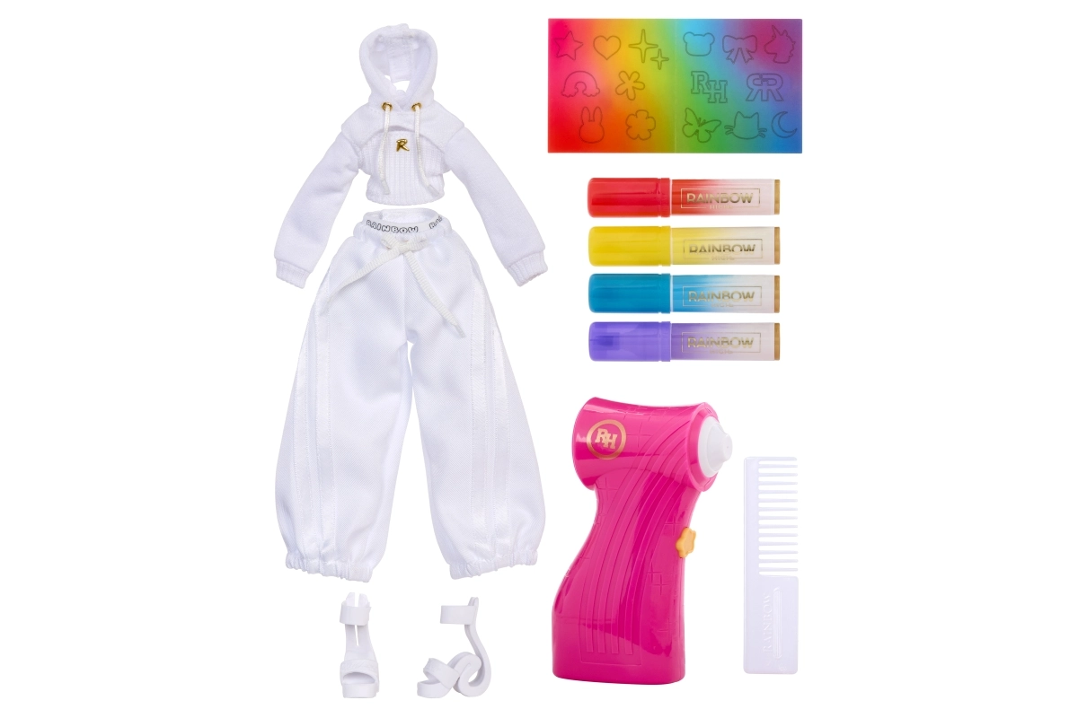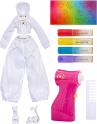 Тази креативна кукла е като празно платно – изцяло в бяло, с бяла коса и тоалет, готови за вашето въображение. В комплекта ще откриете четири миещи се дъгови флумастера (червен, жълт, син, лилав) и практичен airbrush за лесно преливане и равномерно нанасяне на цвета.