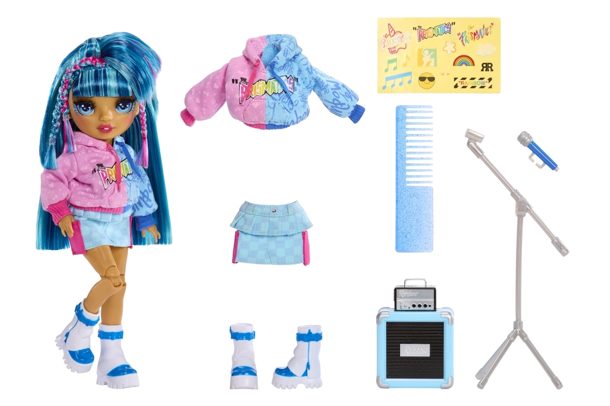 - кукла, двуделен тоалет, обувки, микрофон (със стойка), мини усилвател, лист със стикери, гребен