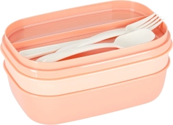 Кутията е изработена от висококачествен пластмаса без BPA. Може да се мие в съдомиялна и да се затопля в микровълнова фурна (без капак) до 100 °C. В комплекта ще намерите и практичен сет прибори (лъжица, вилица, нож).