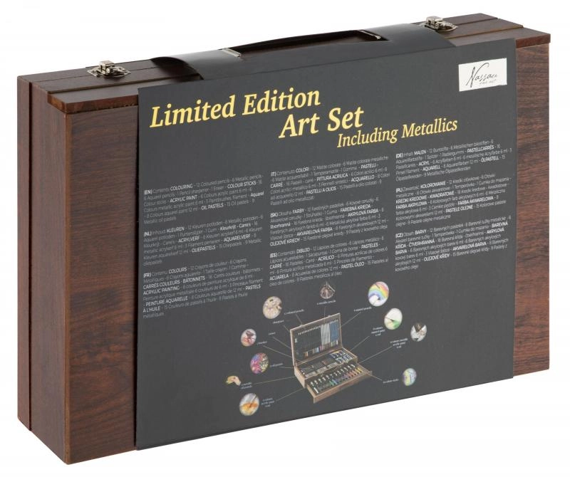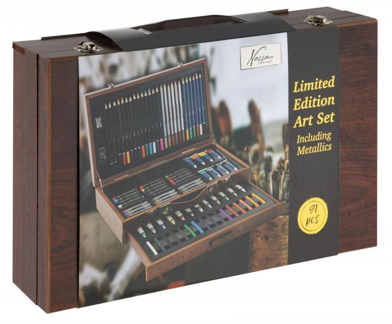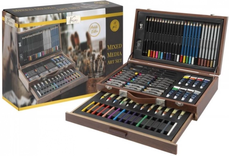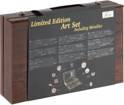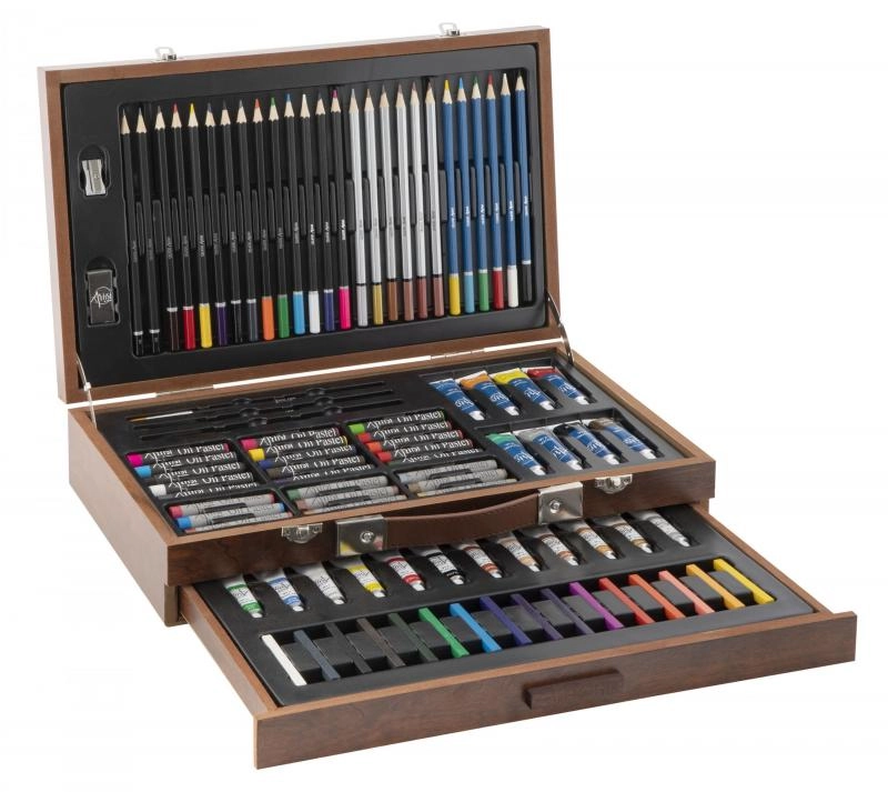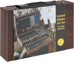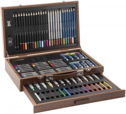 Открийте универсален художествен комплект в елегантен дървен куфар, който предлага всичко за рисуване и скициране. Здрава конструкция, капак с заключване и здрави закопчалки осигуряват безопасно съхранение и лесно пренасяне. В комплекта ще намерите широка гама от бои, моливи, пастели, тебешири и четки за безкрайни часове творчество. Идеален за начинаещи и напреднали.