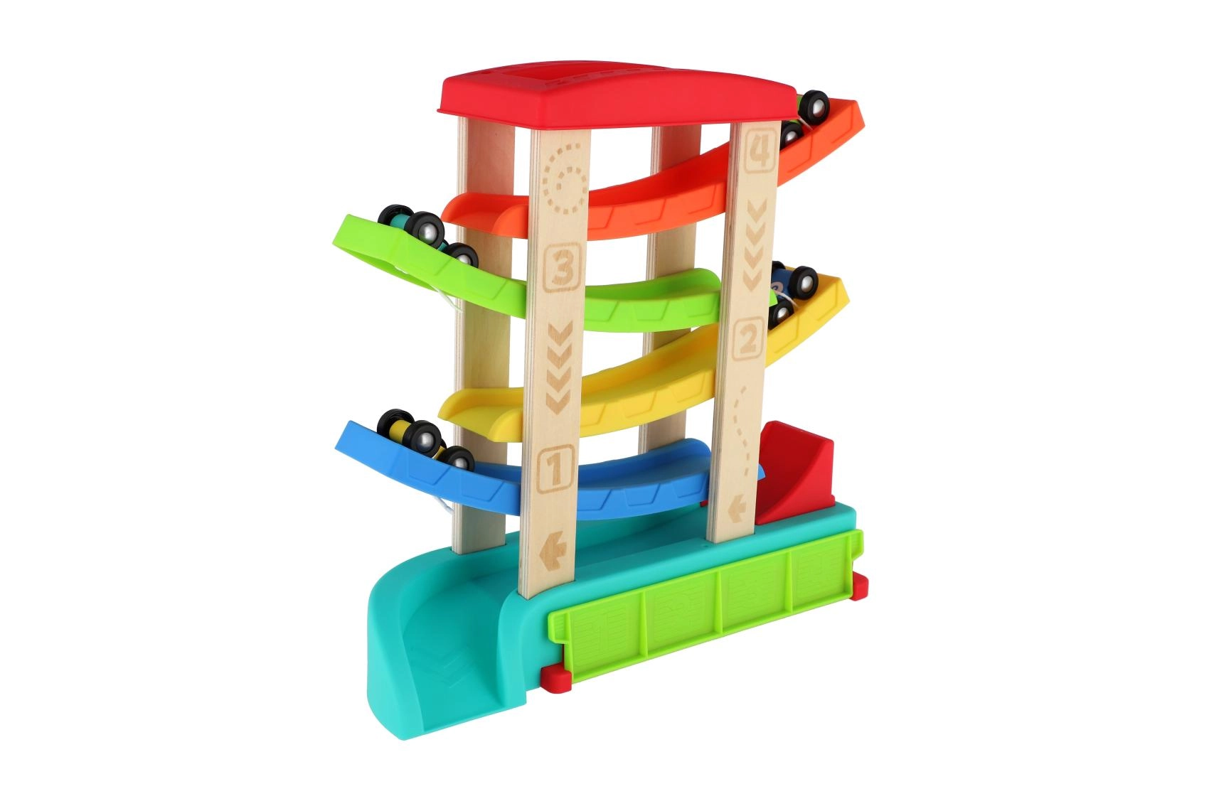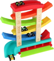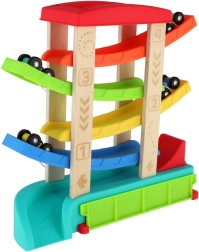 Достатъчно е да поставите една от 4-те включени колички на старта и да гледате как благодарение на гравитацията постепенно преминава през отделните нива до финала. Размерите 33 × 32 × 10 см осигуряват идеална големина за игра на маса и на пода, а заоблените ръбове и стабилната основа гарантират безопасност.