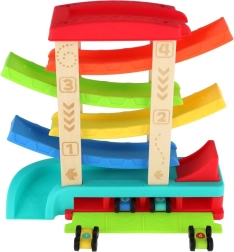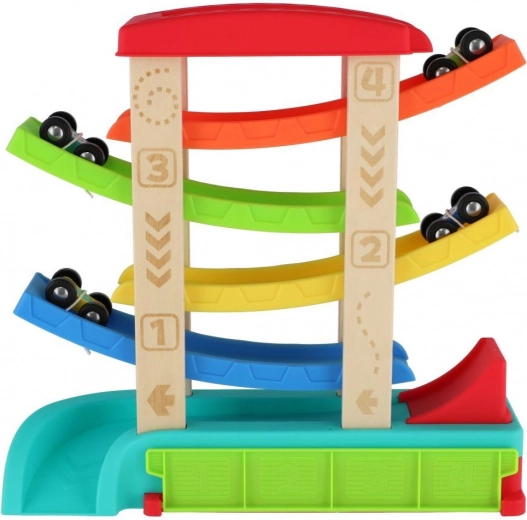Тази каскадна състезателна писта комбинира здрави дървени колонки и издръжливи пластмасови рампи в ярки цветове, които стимулират детското любопитство и визуалното възприятие. Децата развиват фината моторика, координацията око–ръка и разбирането на причинно-следствените връзки, докато наблюдават движението на количките.