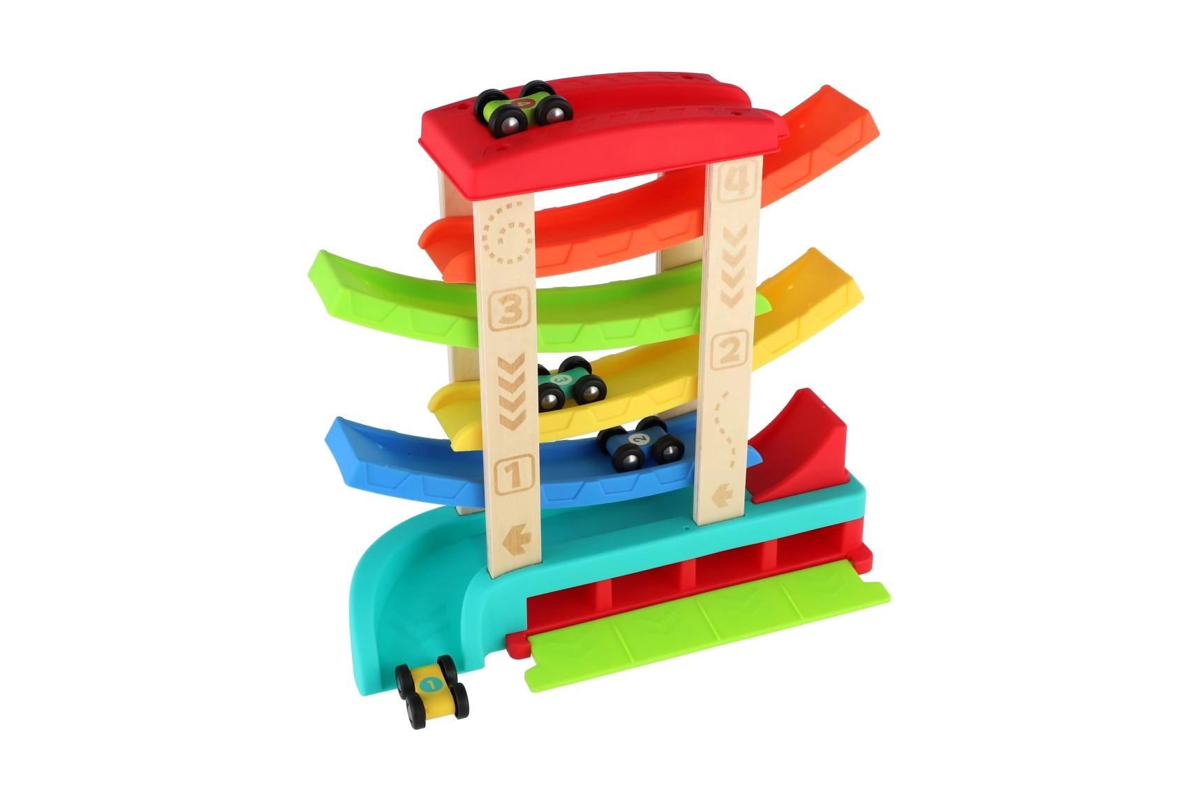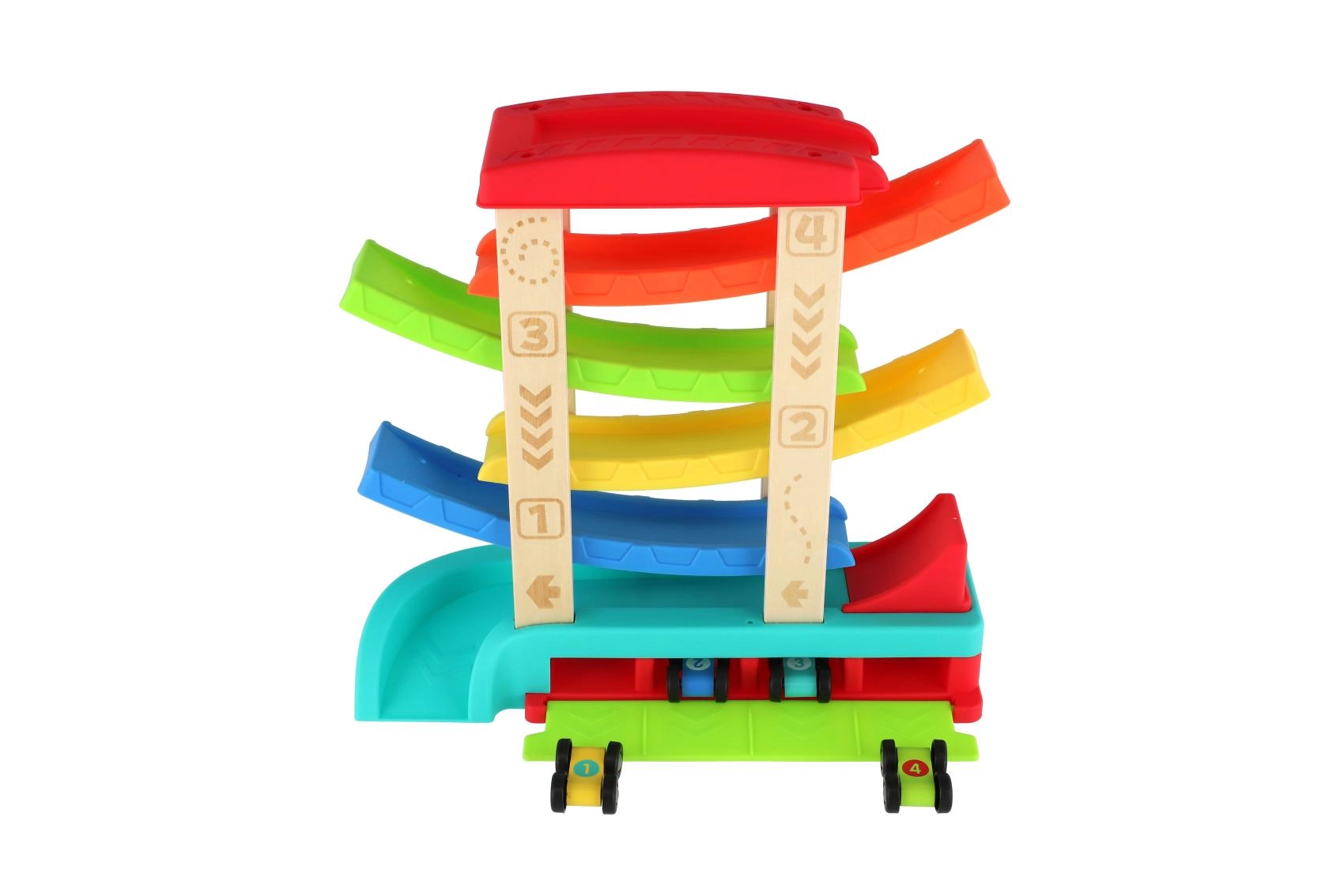 Четири каскадни рампи осигуряват плавно и бързо спускане, което мотивира децата да пускат състезанието отново и отново.