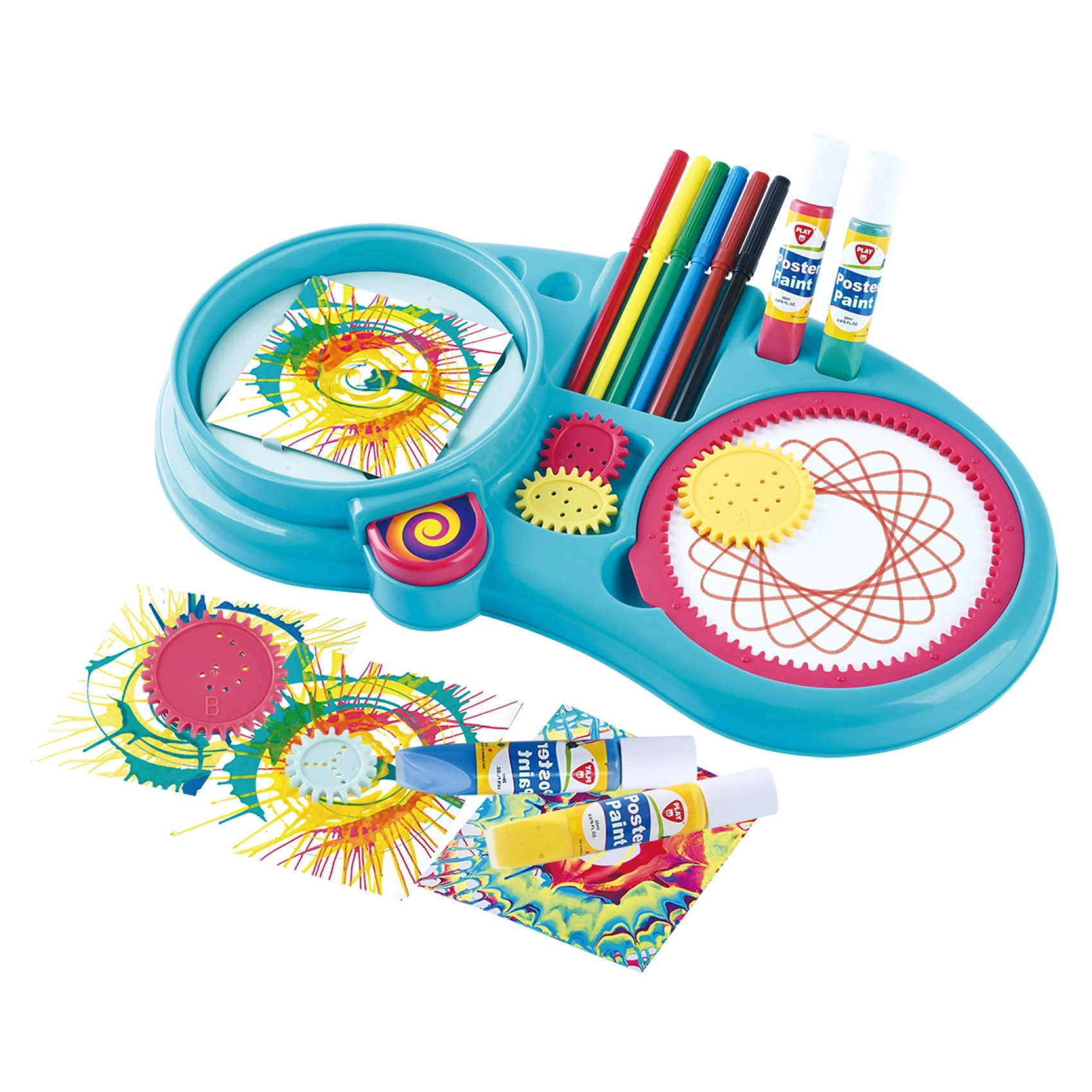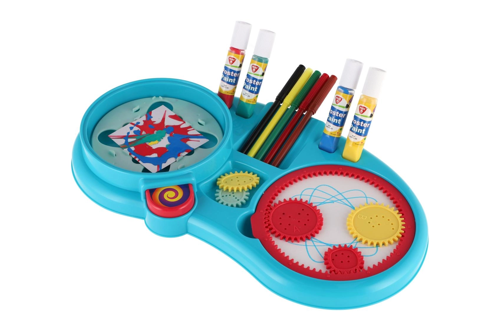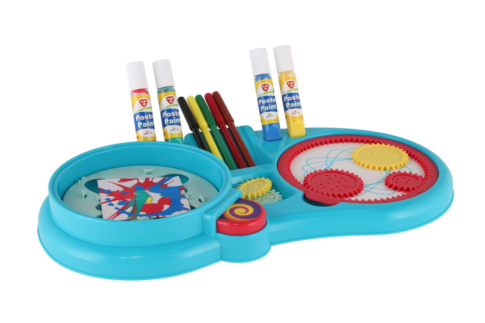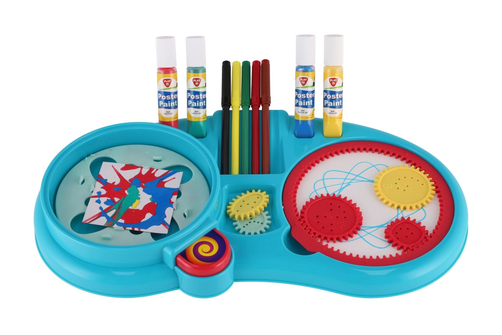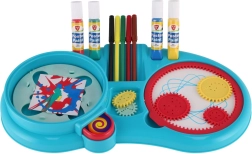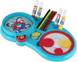 - Богато съдържание: флумастери, бои, зъбни колелца, въртяща се платформа