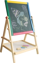 Тази дървена, двустранна и многофункционална дъска е чудесен помощник за ежедневна игра и учене. Децата могат да тренират писане, рисуване и първи сметки на магнитната бяла страна със сухо изтриване или да творят с тебешир върху традиционната черна повърхност. Благодарение на просторната полица всички принадлежности са винаги под ръка.