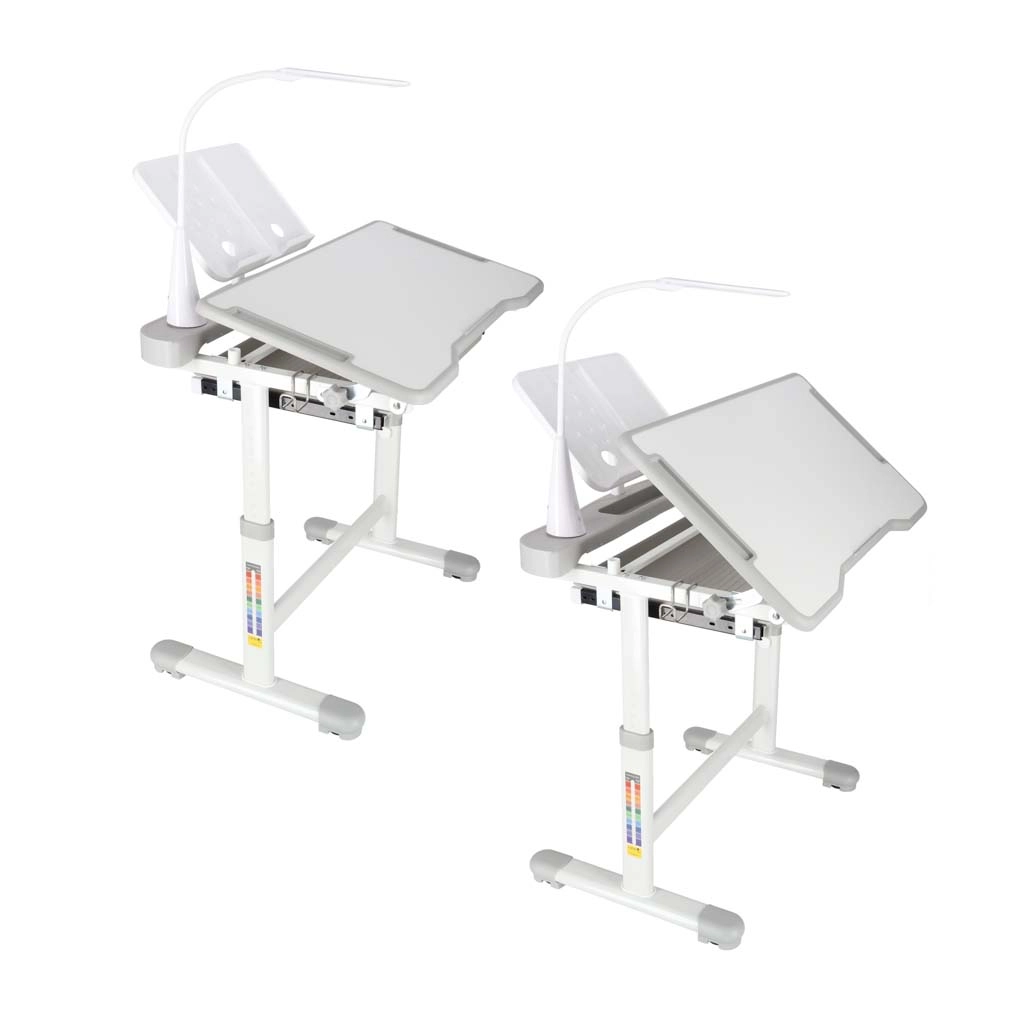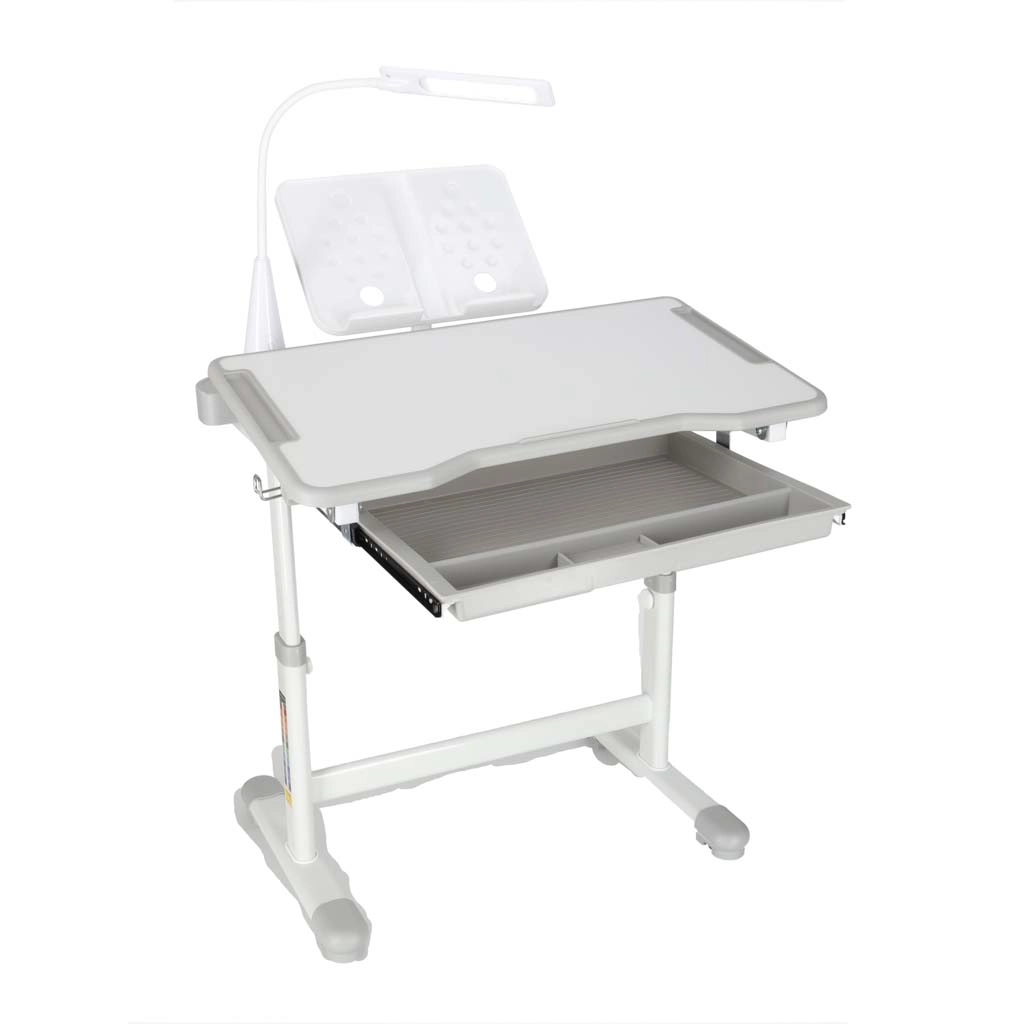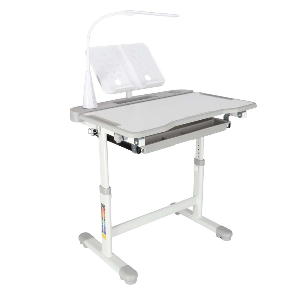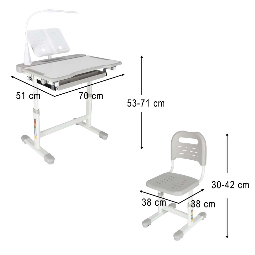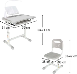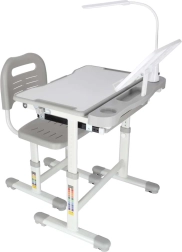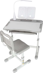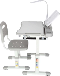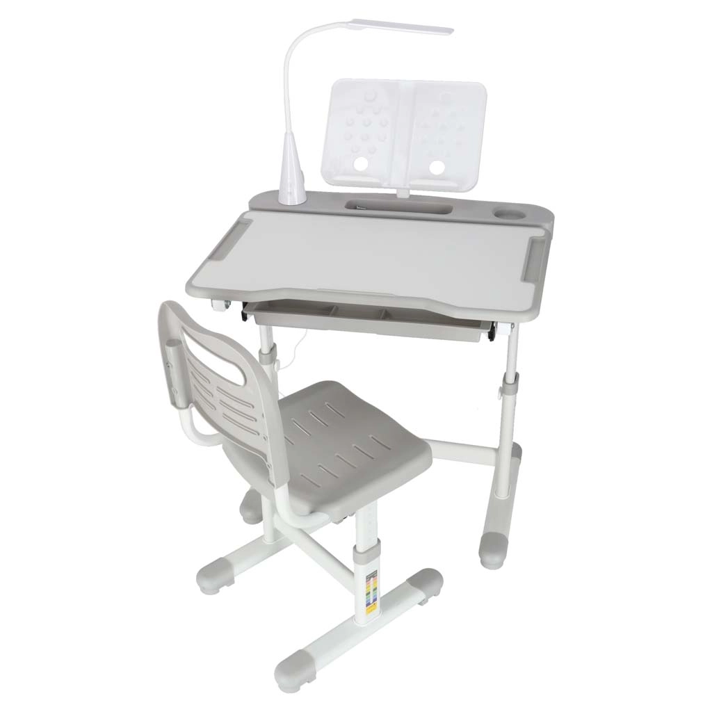 Практично детско писалище със стол и USB LED лампа в сив цвят създава ергономично и подредено място за учене и творчество. Височината на масата и стола може плавно да се настройва според ръста на детето, налични са повдигащ се плот, голямо чекмедже с органайзер, държач за раница, място за чаша и поставка за книга. LED лампата предлага 3 режима на светлина и 3 нива на яркост за правилно осветление през деня и нощта.
