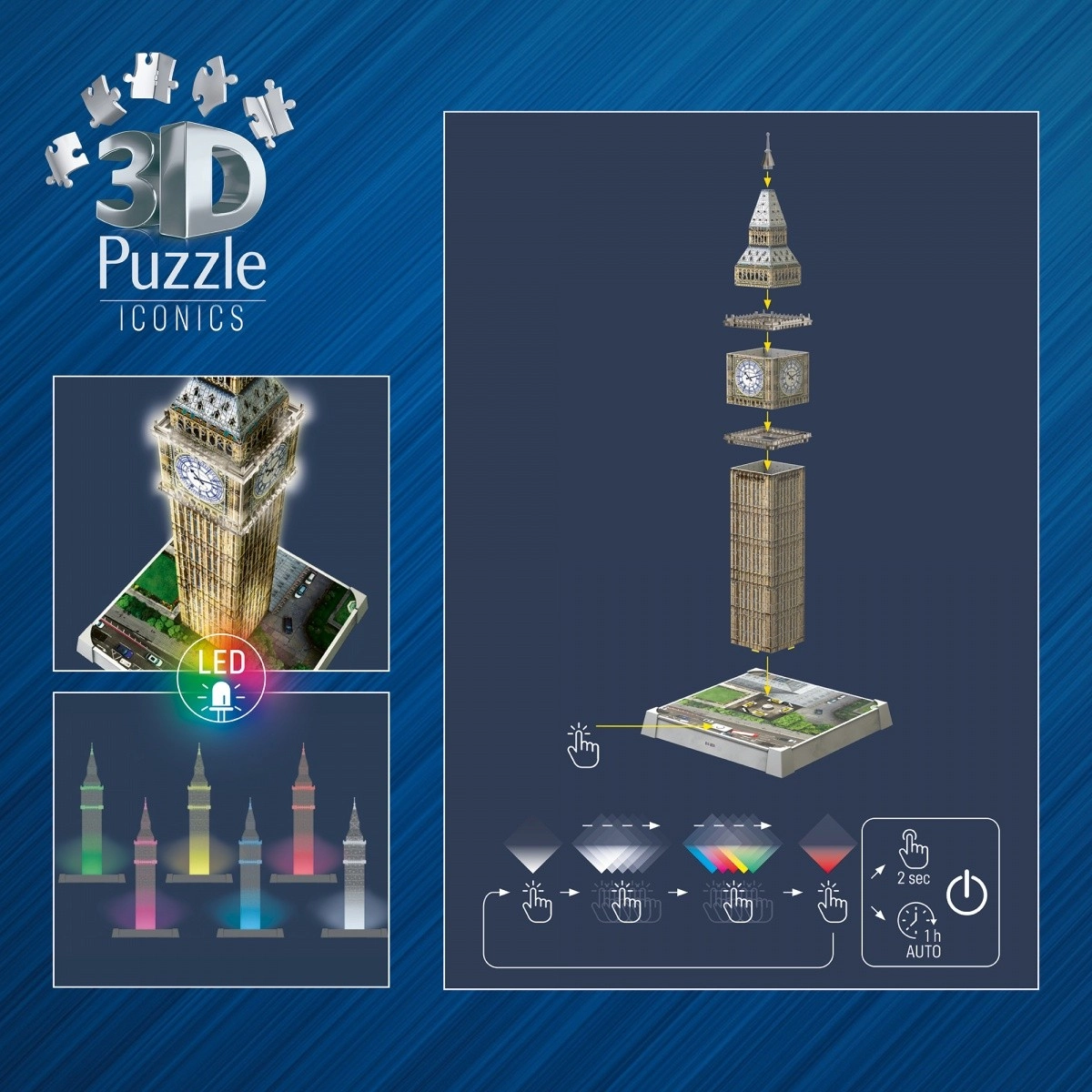 Създайте си у дома частица от Лондон с детайлен 3D модел на Биг Бен. Качествените, гъвкави и формовани пластмасови елементи с технология Easy Click гарантират здрава и стабилна конструкция без лепило. Подреждането е забавно, интуитивно и идеално за любители на архитектурата и пъзелите.