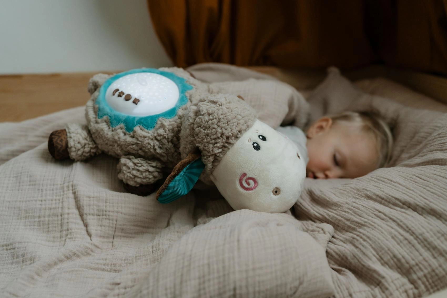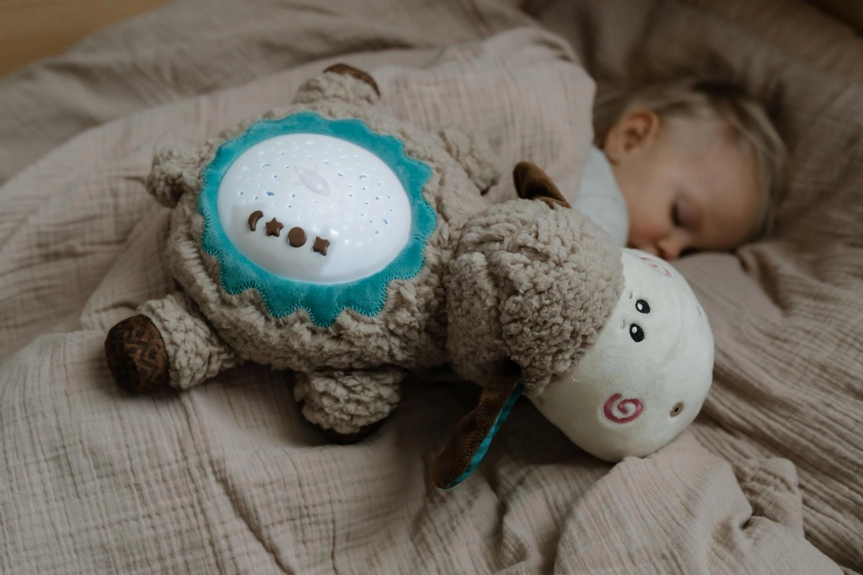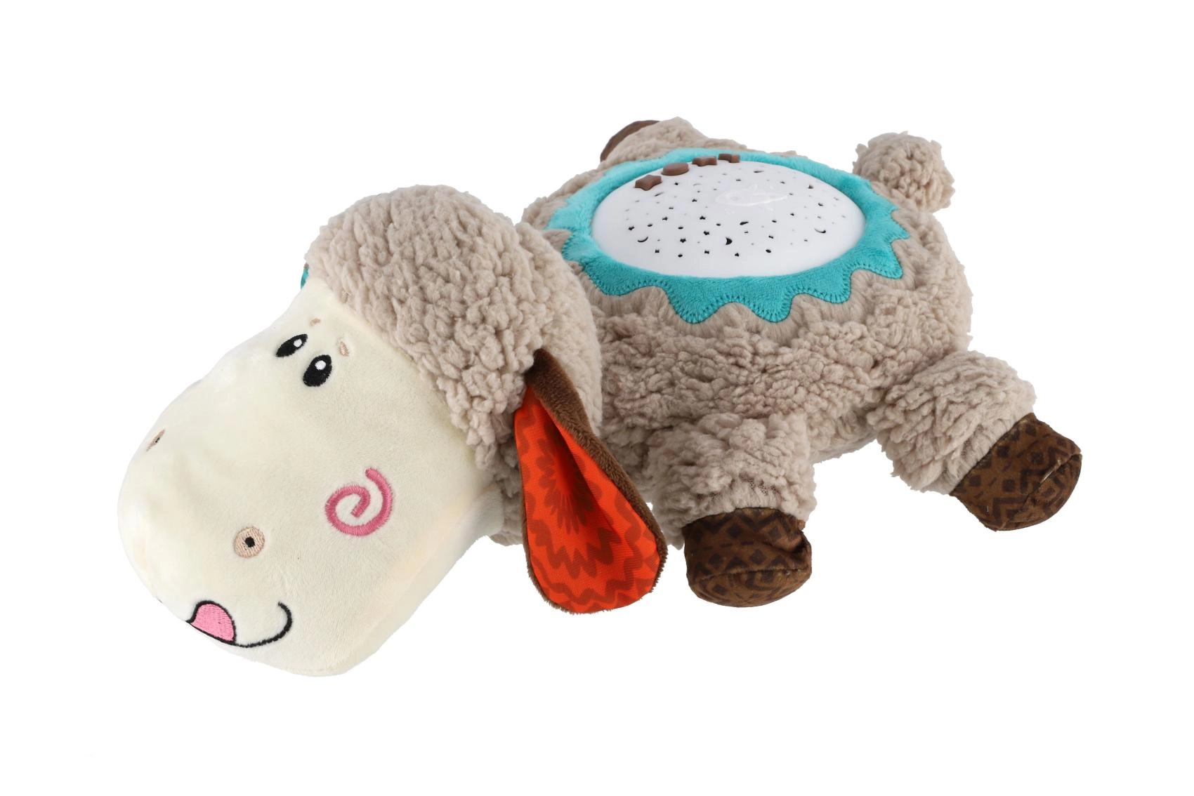 Това сладко агънце е проектирано като успокояващ спътник за бебета и малки деца. Комбинира нощна светлина, звезден проектор и приятни звуци в една гушкава играчка, която улеснява вечерните ритуали. С натискане на бутона се включва с нежна светлина и проектира звездички на тавана, докато тихо свири мелодии или приглушени звуци от природата.