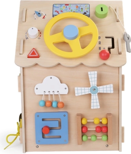 Дървената активна къщичка съчетава игра и учене в едно. Предлага зъбни колела, волан и скоростен лост, смятало, лабиринт, въртяща се перка и различни видове ключалки и резета за развитие на фината моторика, логиката и самостоятелността. Изработена е от висококачествена естествена дървесина с безопасни, гладки ръбове и нетоксични бои. Страхотен избор за любознателни деца от 3 години.