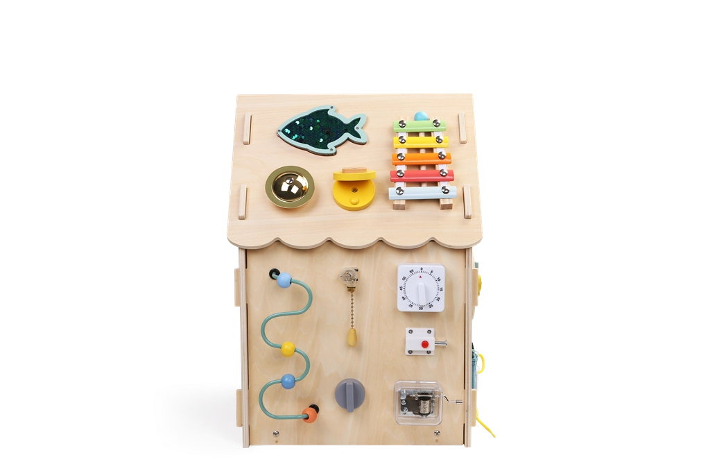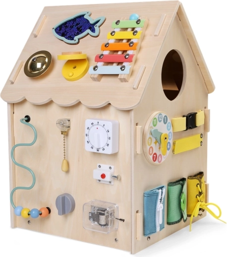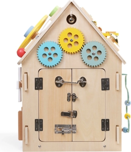 Къщичката подпомага концентрацията, търпението и ежедневни умения като закопчаване на цип, копчета, връзване на връзки и използване на катарами. Здравата дървена конструкция, гладките ръбове и нетоксичните бои осигуряват безопасна употреба.