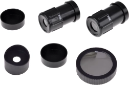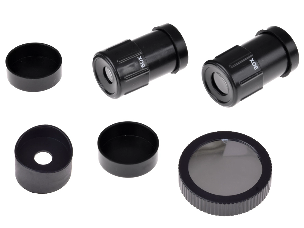 - Зенитно огледало, мембранен филтър (за безопасно наблюдение на Слънцето), търсач, държач за телефон, поставка за аксесоари, капачка за окуляр