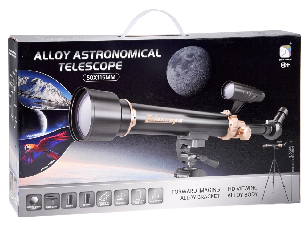 Започнете да откривате Вселената с този универсален астрономически телескоп. Предлага увеличение 30x и 60x, фокусно разстояние 500 mm и стабилен алуминиев статив 1,3 m. В комплекта ще намерите пълен набор аксесоари, включително окуляри, търсач, зенитно огледало и държач за телефон. Включен е и специален мембранен филтър за безопасно наблюдение на Слънцето.