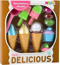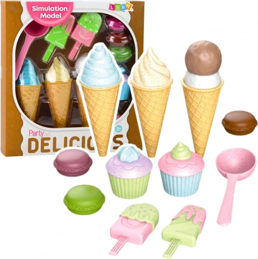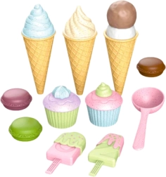 Пъстър комплект сладоледи и десерти ще зарадва всички малки сладкари. Включва фунийки, сладоледи на клечка, къпкейкове, макарони и лъжица за сладолед – всичко от безопасна пластмаса. Насърчава креативността, фината моторика и ролевите игри в сладкарница или сладоледена.