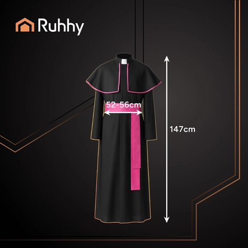 Комплектът включва дълга черна сутана с колар, наметка с кант и литургичен пояс, които заедно създават изразителна и достойна визия. Благодарение на универсалния размер XL/XXL се напасва удобно към различни фигури и е отличен за Halloween, маскен бал, тематични партита и сценични изяви.