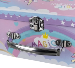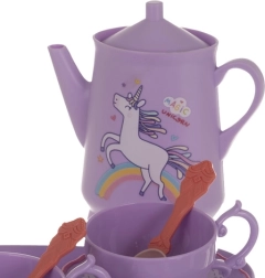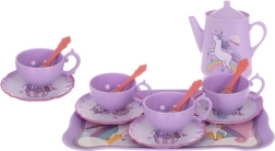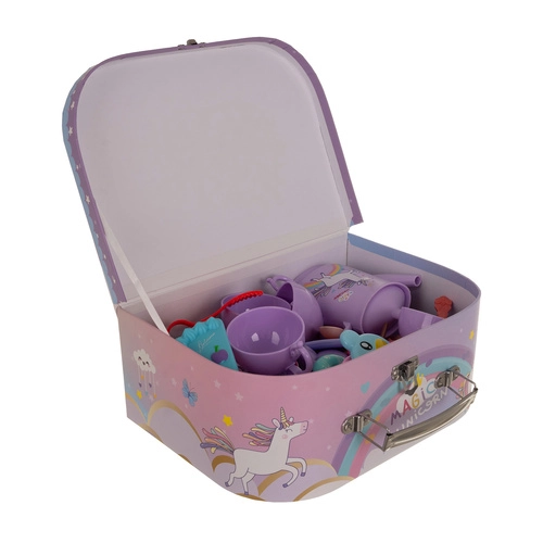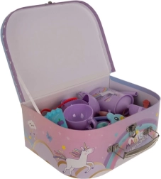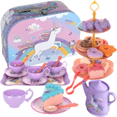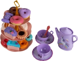 Очарователен детски чаен сервиз в практично куфарче ще зарадва всеки малък домакин. Включва чайник, чашки, чинийки, поднос, триетажна стойка за сладкиши и 21 лакомства. Благодарение на качествените материали е устойчив на напукване и надраскване, насърчава креативната игра и развитието на социални умения и гладката му повърхност се почиства лесно.