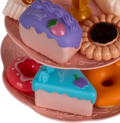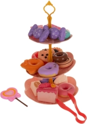 Съдържание на комплекта: куфарче с дръжка и метално закопчаване, триетажна стойка за сладкиши, чайник с капаче, 4 чашки, 4 чинийки, 4 декоративни лъжички, щипки, сервиращ поднос, 21 лакомства (бонбони, понички, макарони, бисквити), инструкция за употреба, кафява транспортна кутия.