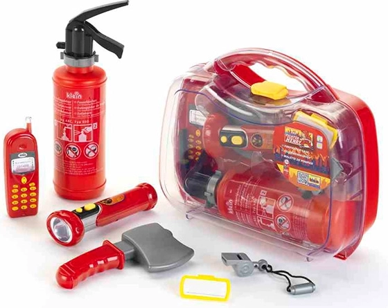 Комплект за малки герои – пълна спасителна игра! Този пожарникарски куфар включва всичко необходимо за вълнуващи приключения: работещ пожарогасител с пръскаща функция, мобилен телефон, брадва, значка с име, свирка и фенерче.