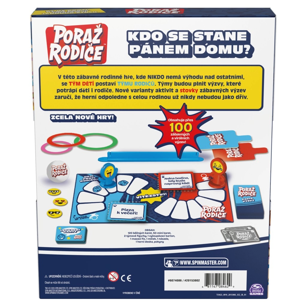 В това освежено издание на любимата игра „Победи родителите“ забавлението се издига на ново ниво. Отборите изпълняват равномерно балансирани предизвикателства, отговарят на куиз въпроси през поколенията и използват кутията на играта, за да създават 3D препятствия от изтласкващи се елементи. Играта е идеална за семейни игрови вечери и носи темпо, хумор и здравословно съревнование между деца и възрастни.