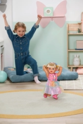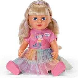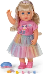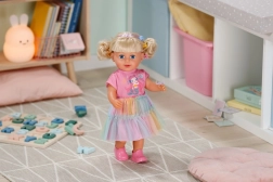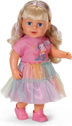 Открийте куклата BABY born Карла 43 см с дълги качествени найлонови коси, които се разресват лесно. В комплекта има 7 аксесоара за оформяне на прическа, куклата има подвижни стави, може да стои самостоятелно и благодарение на твърдото телце може да се къпе във ваната. Стайлингът се допълва от сладка тениска, дъгов тюлен поличка и розови обувки – перфектни за креативна игра и прически.