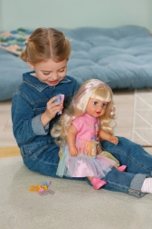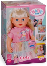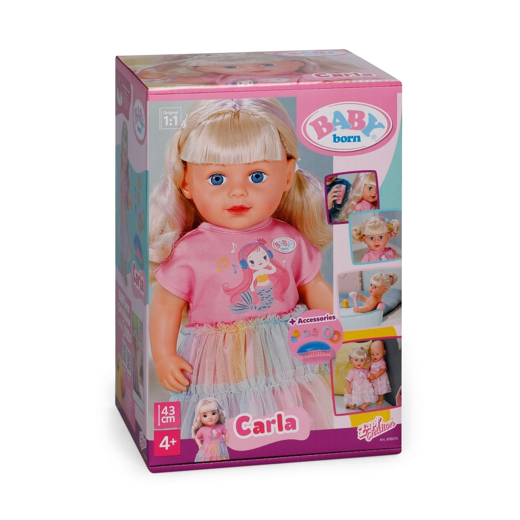 Куклата BABY born Карла предлага на децата много възможности за креативна игра. Дългите и меки найлонови коси са идеални за сресване, опашки и сплитане на плитки. Комплектът от 7 аксесоара – четка, ластичета и шноли – насърчава фантазията при ежедневния стайлинг.