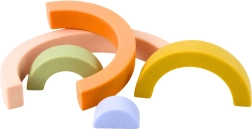 Този пастелен дъгов комплект от висококачествена гума ще очарова всяко дете и родител. Отделните дъги в различни размери могат да се подреждат, наслояват и свързват в оригинални форми. Мекият материал е приятен на допир и щадящ към малките ръчички, което го прави идеален за първи стъпки в строенето.