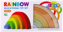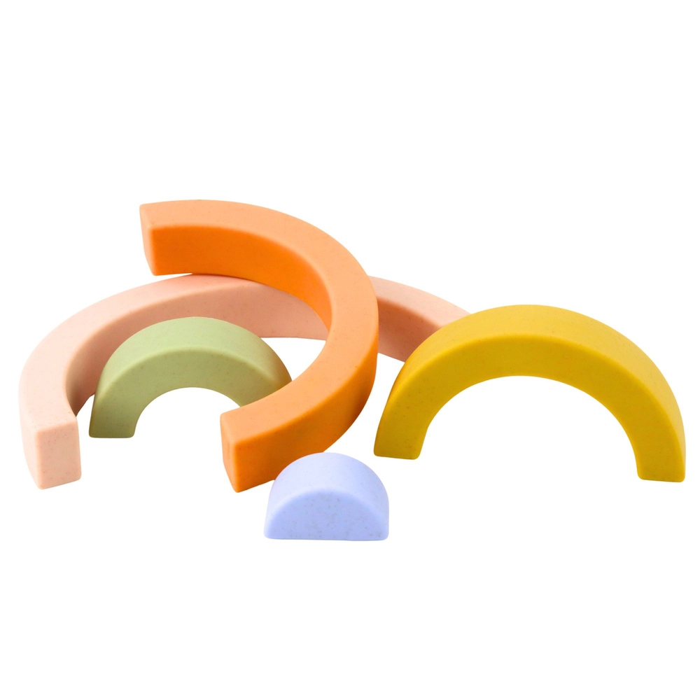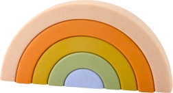 Пастелният дъгов строителен комплект от гума е чудесна сензорна играчка за най-малките. Подпомага креативността, логическото мислене и координацията на движенията. Петте меки части в различни размери могат свободно да се подреждат и комбинират в множество конструкции. Безопасните, меки и гъвкави кубчета без остри ръбове гарантират комфортна и безопасна игра.