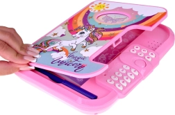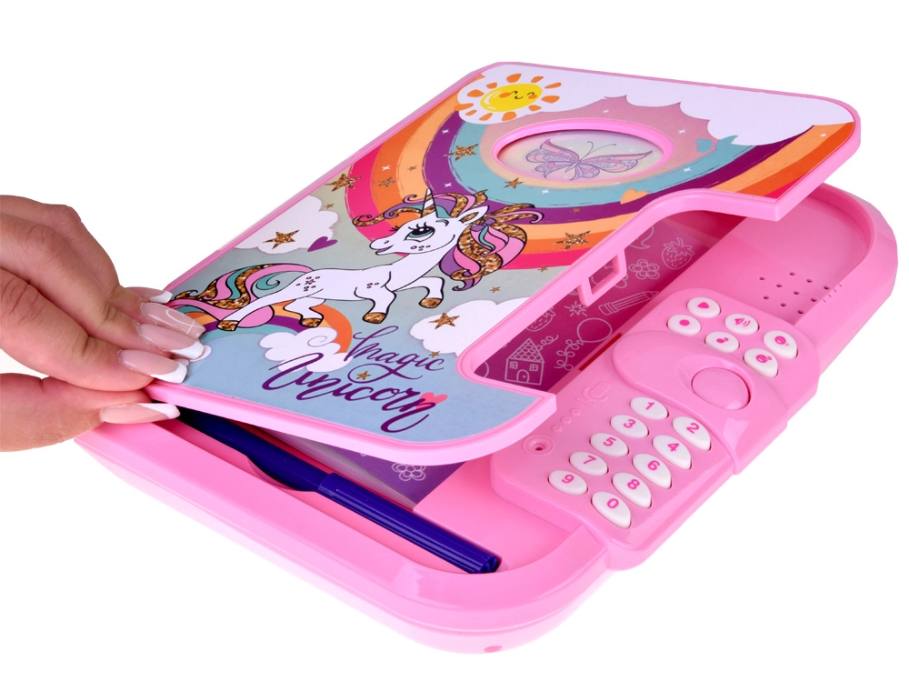 Интерактивният дневник с мотив еднорог е мечтаното място за всички детски мисли, рисунки и тайни. След въвеждане на правилния код дневникът се отваря и разкрива розова тетрадка, писец-флумастер и тайно сандъче за малки съкровища. Предната рамка може да се персонализира със сменяема картинка.