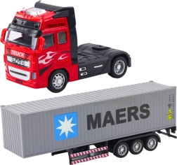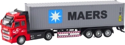 Реалистичен контейнерен камион с pull-back задвижване, който ще зарадва всички малки почитатели на техниката. Комбинира метални елементи и устойчив пластмасов материал за дълъг живот, има отваряеми врати, голям отделяем контейнер и гумени въртящи се колела за плавно движение.