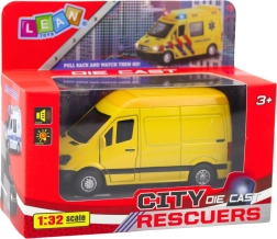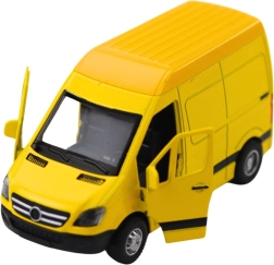 Реалистичен жълт ван в мащаб 1:32 комбинира метални части и качествена пластмаса за по-голяма издръжливост и атрактивен вид. Предлага механично задвижване тип pull back, отварящи се врати и светлинни и звукови ефекти, което го прави идеален както за игра, така и като колекционерски модел.
