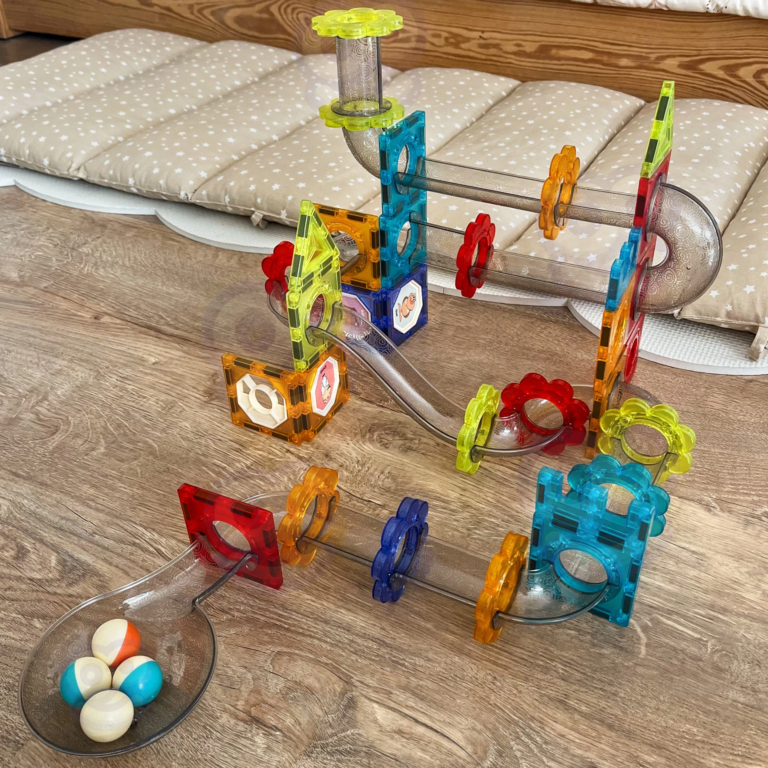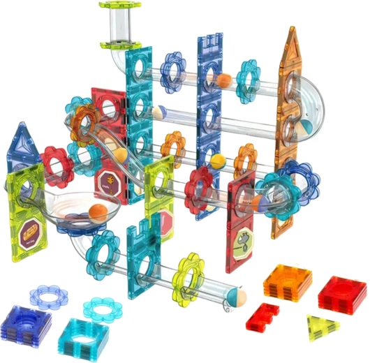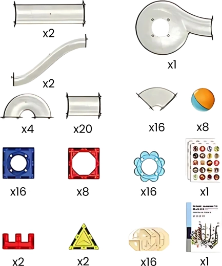 - Магнитни плочки с различни форми и цветове; прозрачни елементи на пистата (улеи, завои, фунии, тунели); цветни топчета; декоративни стикери; илюстрирано ръководство