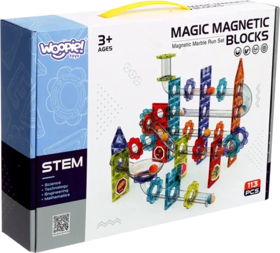 Открийте света на създаването и физиката с креативния конструктор WOOPIE: магнитна писта за топчета с 113 части. Прозрачните тръби, цветните плочки и силните магнити позволяват строене на стабилни многоетажни трасета, по които децата на практика опознават гравитацията и движението. Идеален за развитие на логическото мислене, пространственото въображение и фината моторика – часове смислено забавление за деца от 3 години.