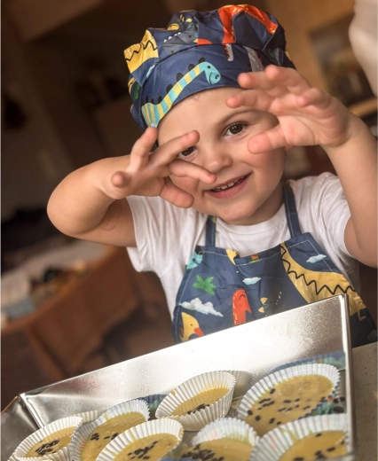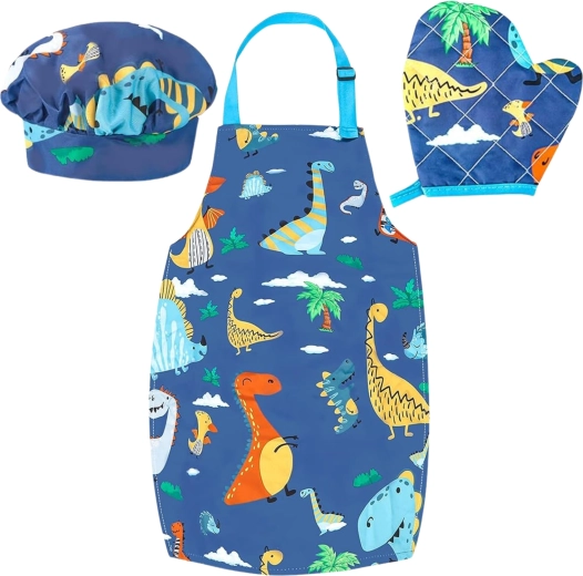 Престилка с регулируемо деколте, шапка с еластичен ластик и кухненска ръкавица защитават дрехите и ръцете. Идеален размер за деца и лесна поддръжка – престилката и шапката могат да се перат в пералня.