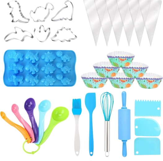 Всичко, от което децата се нуждаят за печене и декориране: точилка, бъркалка, шпатула, силиконова четка, мерителни лъжички, формички за бисквити, пошове за декориране, кошнички, стъргалки и силиконова форма за мини динозаври.