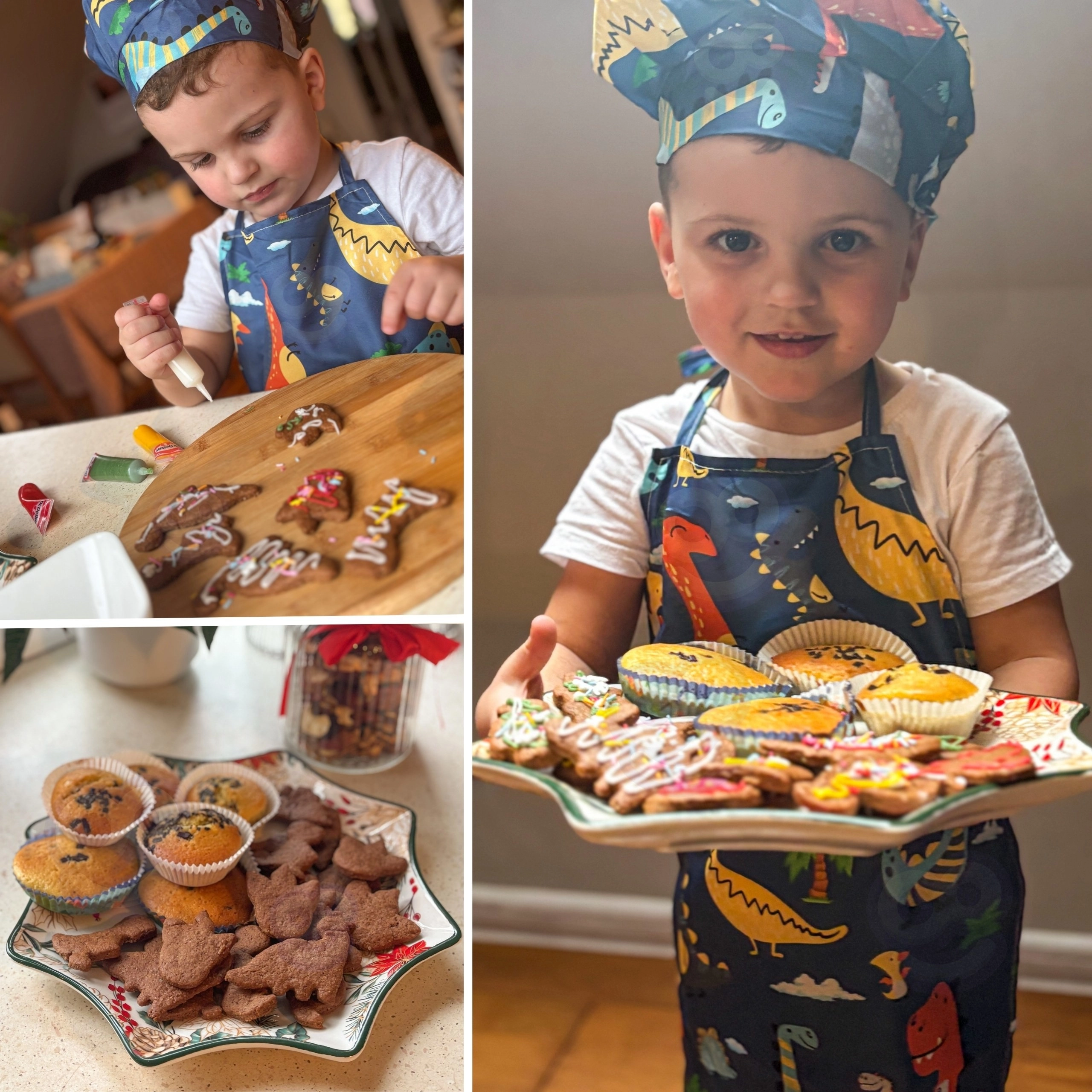 - Престилка с регулиране, готварска шапка с ластик, кухненска ръкавица, точилка, бъркалка, силиконова четка, шпатула, 5 мерителни лъжички, 6 форми за бисквити, 12 пошa за декориране, 6 хартиени кошнички за мъфини, 3 стъргалки за тесто, силиконова форма за мини динозаври