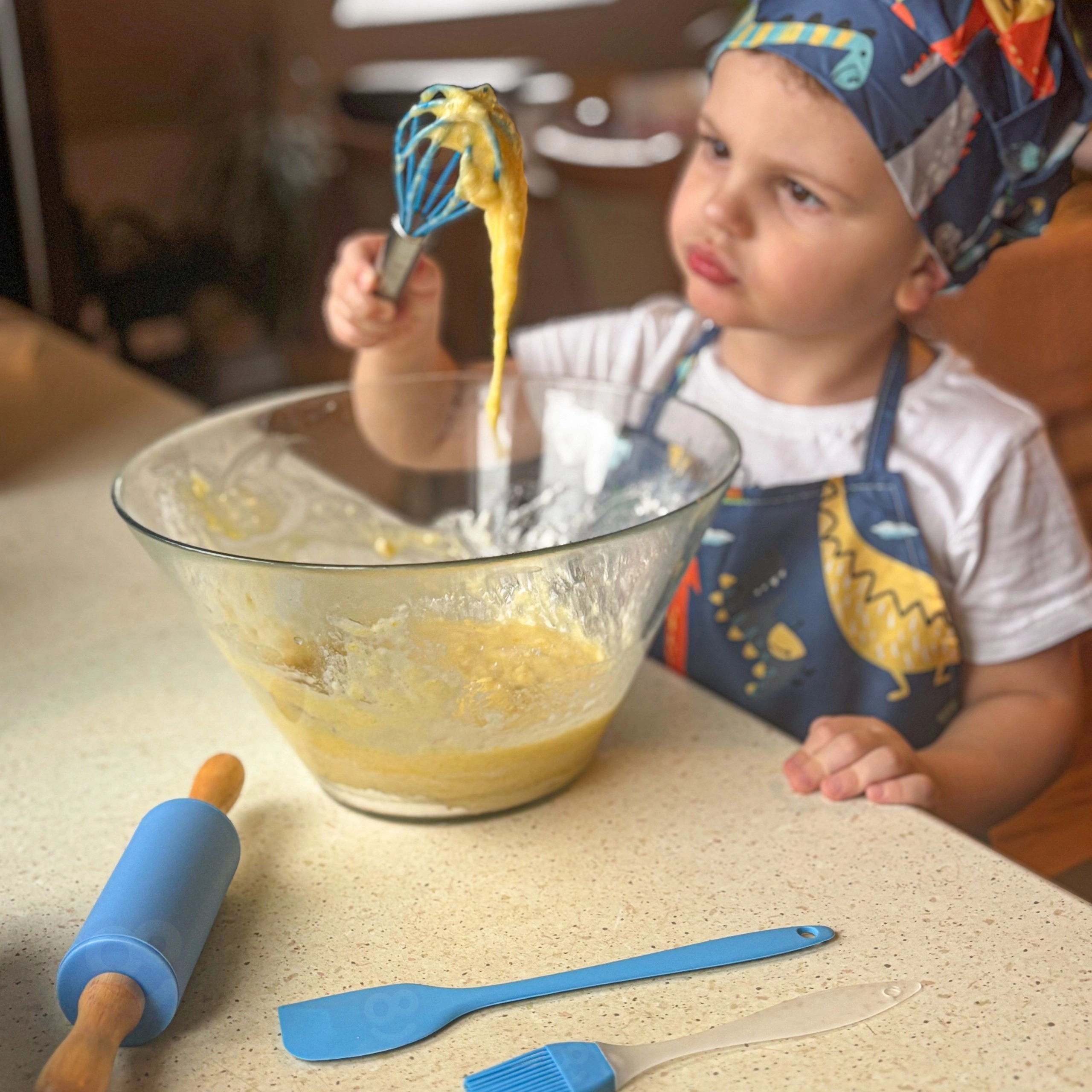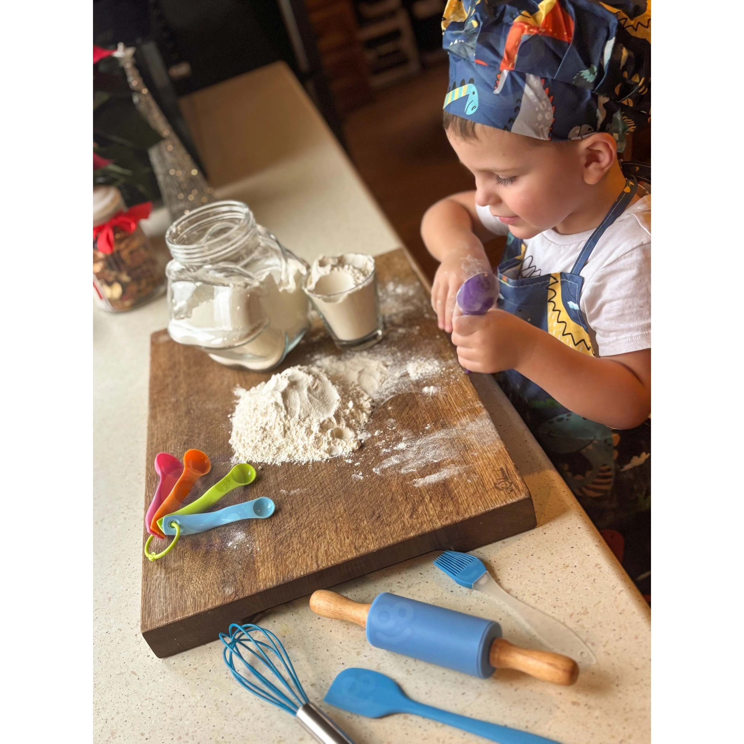 Влезте с децата в света на печенето и готвенето! Цветният кухненски комплект WOOPIE с мотив динозаври съчетава забава и учене – от разбъркване и разточване на тесто до декориране на десерти. Съдържа безопасни, леки инструменти, регулируема престилка, шапка с ластик и силиконови форми. Всичко е съобразено с малките ръчички, лесно за почистване и насърчава креативността и самостоятелността на децата от 3 години.