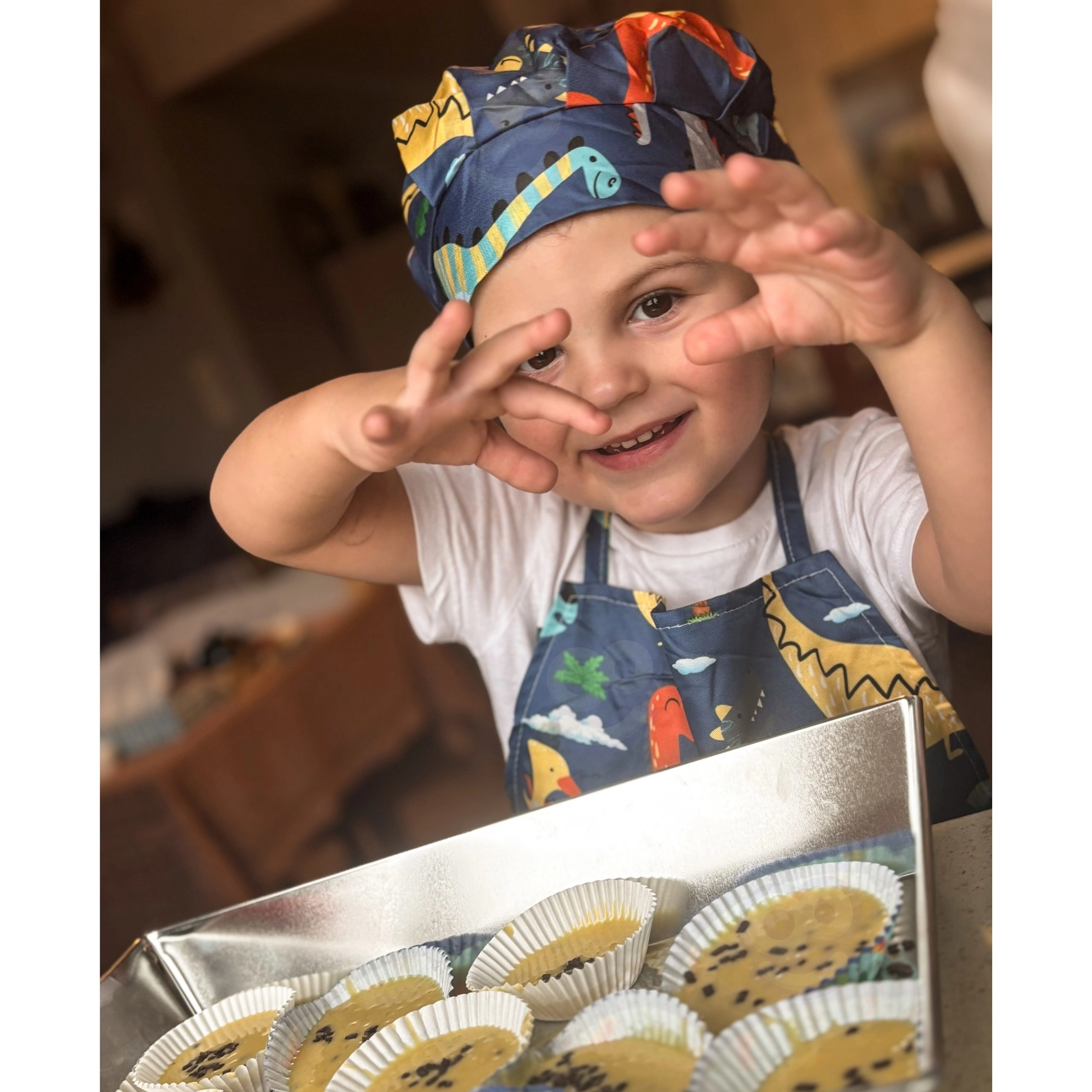 Детският комплект за малки готвачи WOOPIE с весел динозавърски десен е идеален за първите стъпки в кухнята. Благодарение на регулируемата презрамка на престилката и еластичната шапка стои отлично, материалите, безопасни за храни, и силиконовите елементи са издръжливи и лесни за измиване. Комплектът подпомага фината моторика, координацията око–ръка и креативността при съвместно готвене.