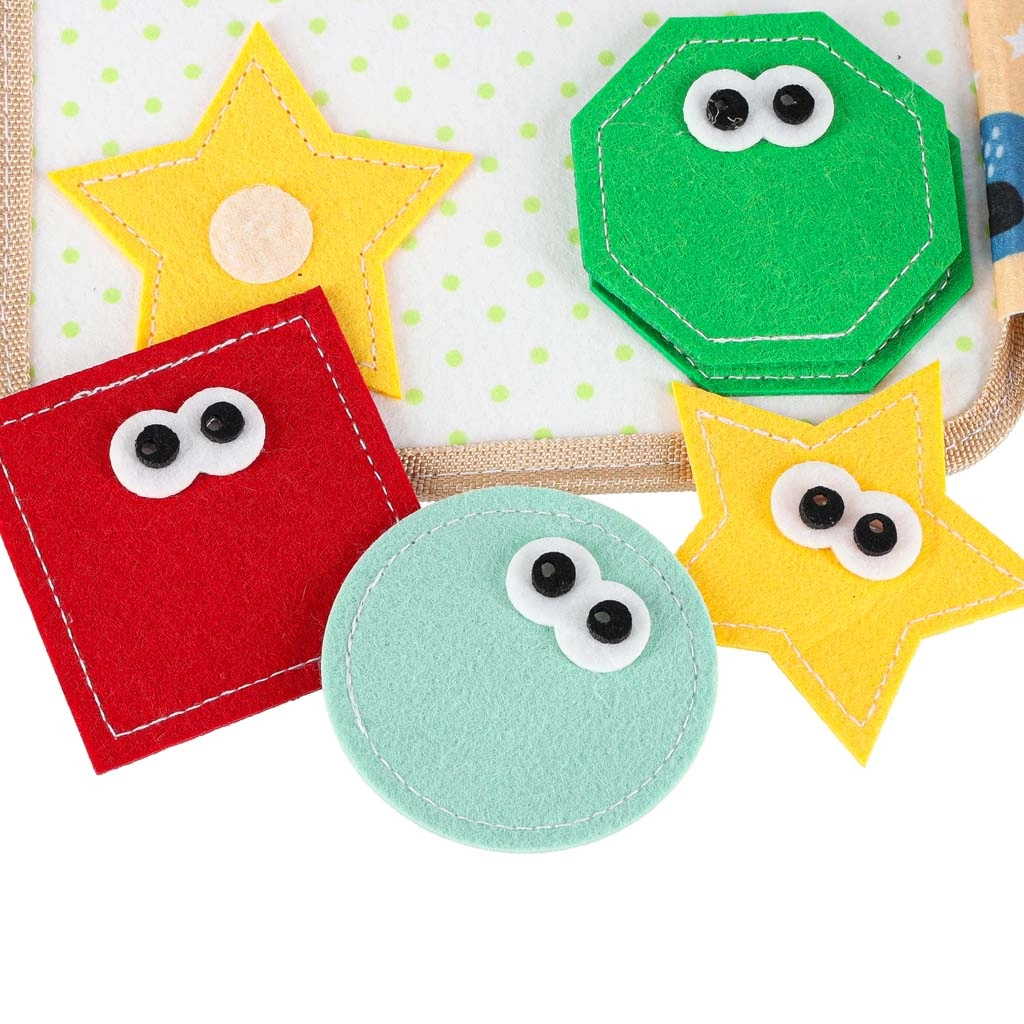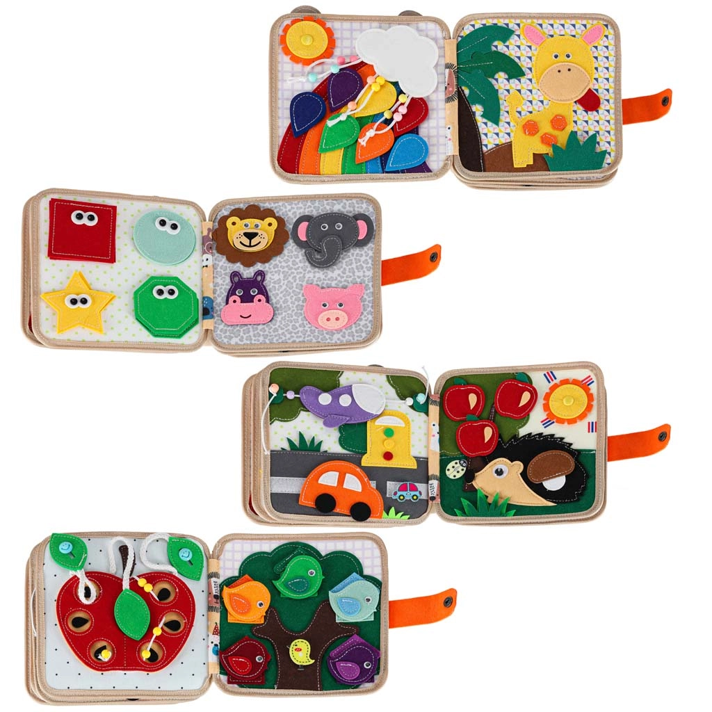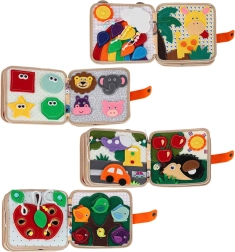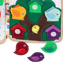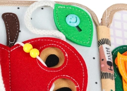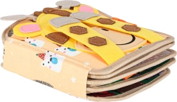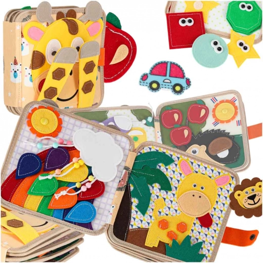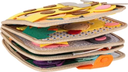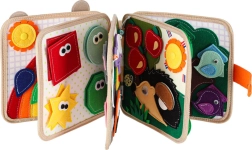 Тази сетивна и образователна книжка от мек филц предлага на децата забавна форма на учене. Подвижните елементи със закопчаване с велкро или тик-так копчета насърчават взаимодействието, тренират координацията око–ръка и развиват фината моторика. Благодарение на пъстрите цветове и разнообразните мотиви децата се учат да разпознават цветове, форми, животни и природни явления.