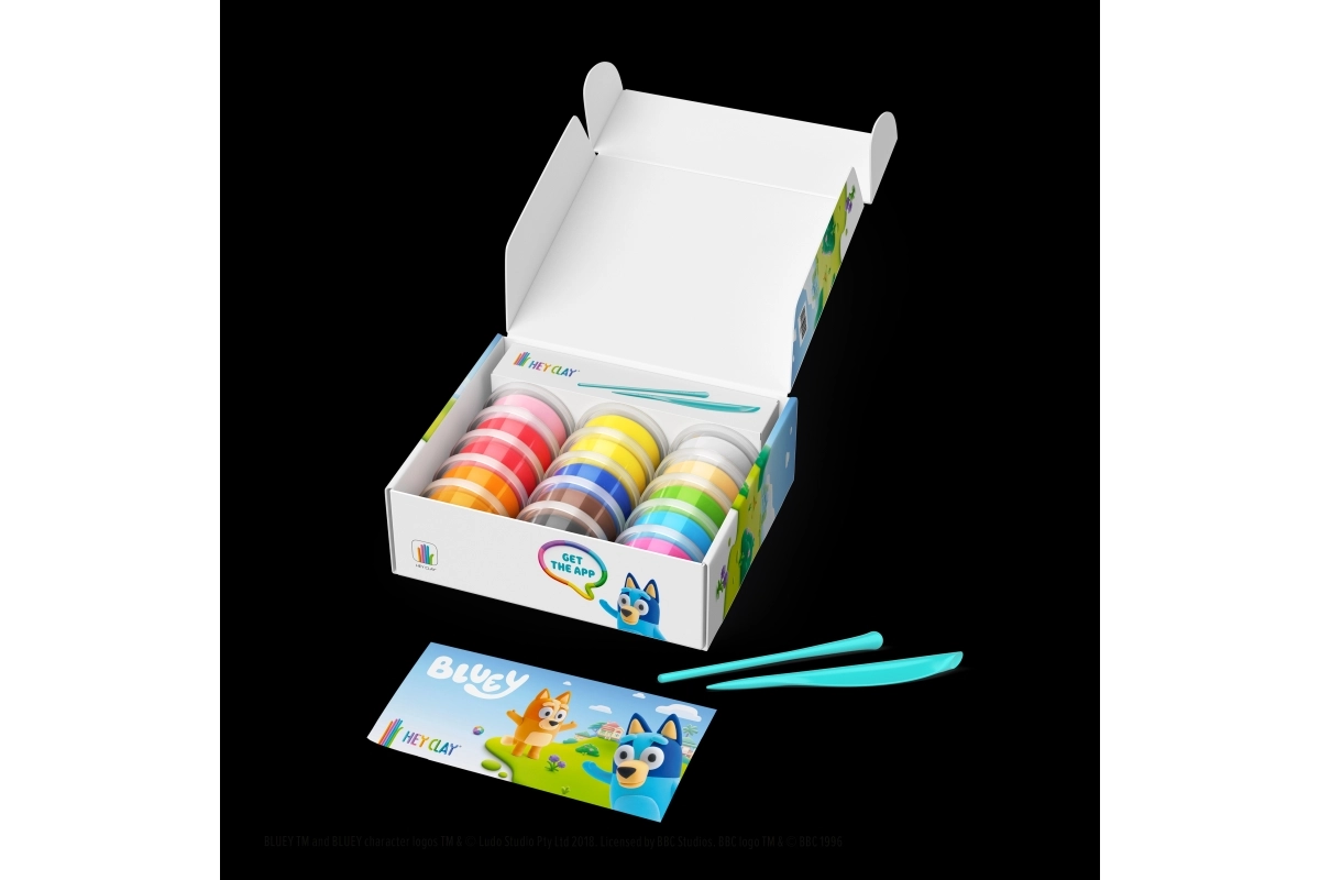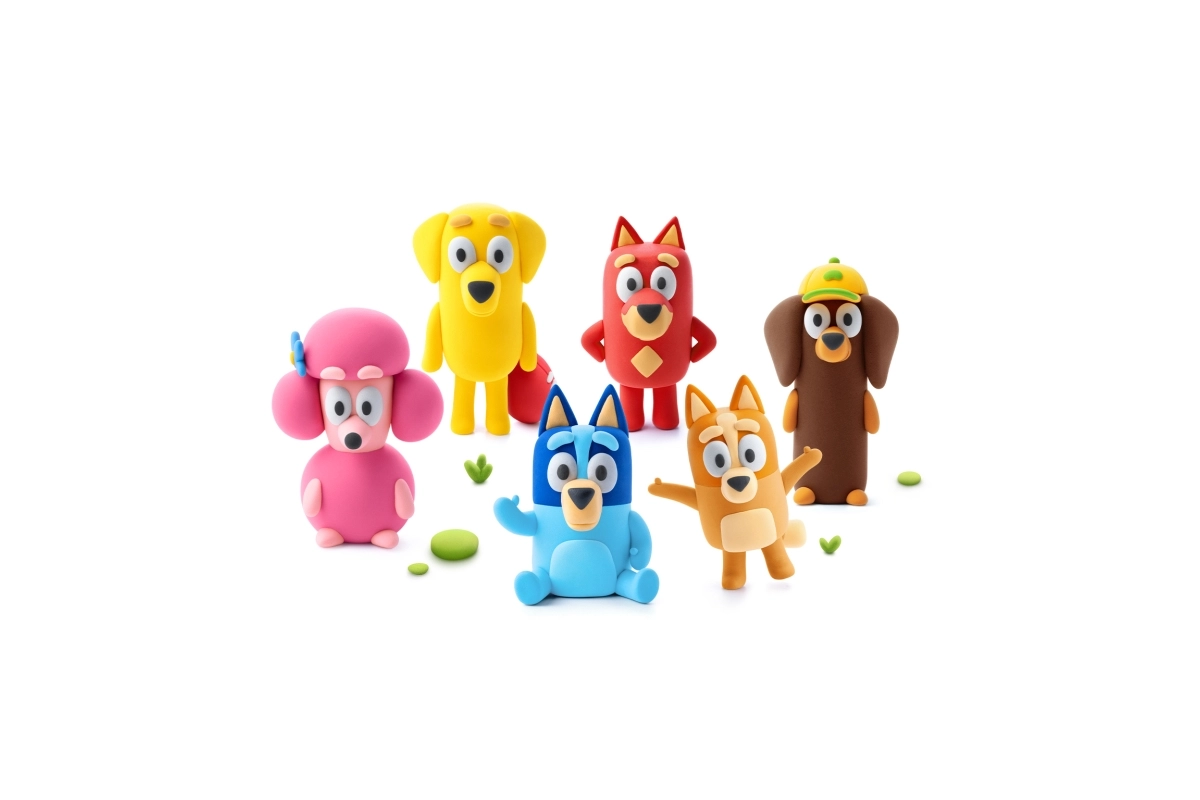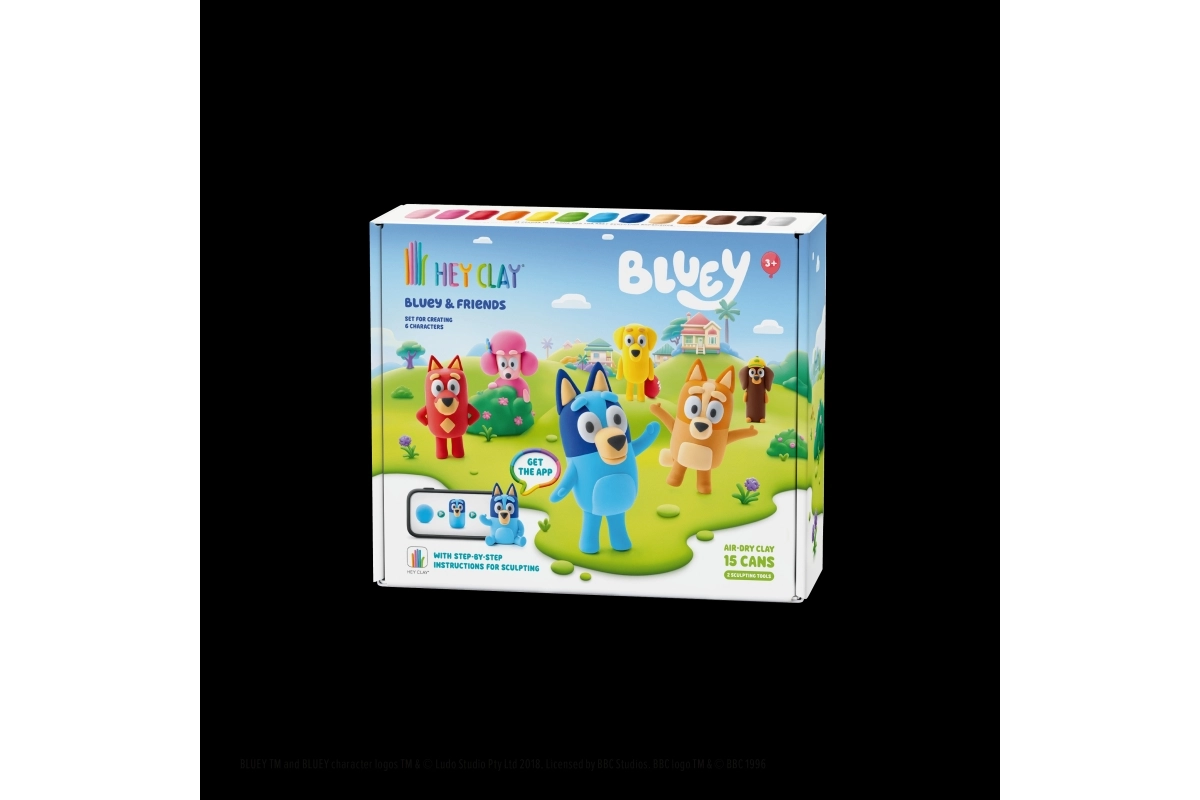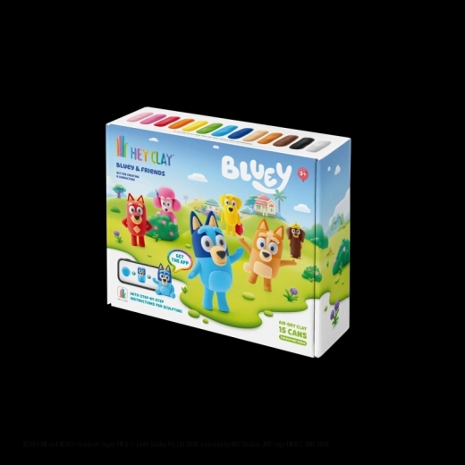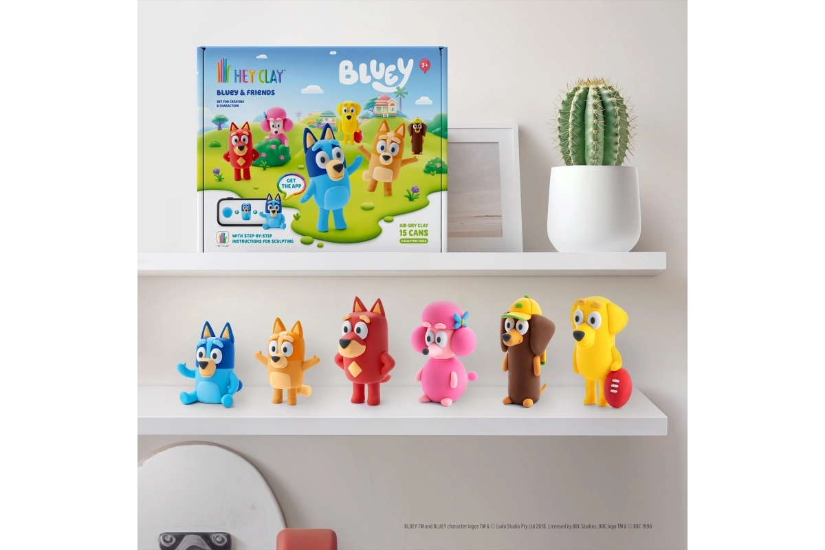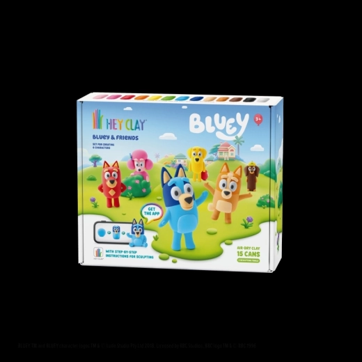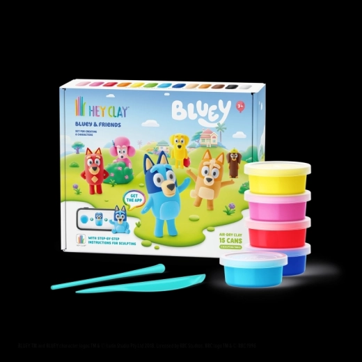 Открийте креативния свят с моделиращата маса HEY CLAY и комплекта Bluey и приятели. Създайте цялата шестица любими герои – Bluey, Bingo, Lucky, Snickers, Coco и Rusty – с помощта на цветна, лека маса и интерактивни упътвания в приложението. Готовите фигурки след изсъхване се втвърдяват и са страхотни за игра и колекциониране.
