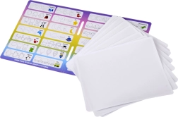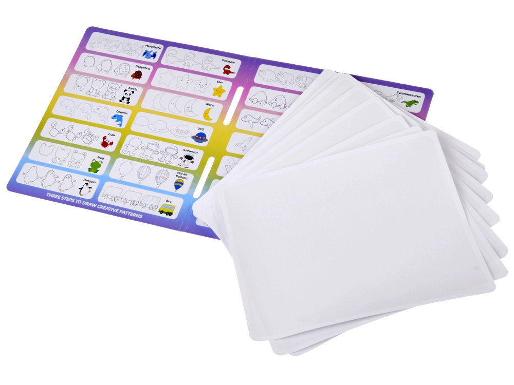 В комплекта има свързан стилус/четка, компактна база за лесно съхранение и комплект бели карти за многократни упражнения по рисуване по прости шаблони.