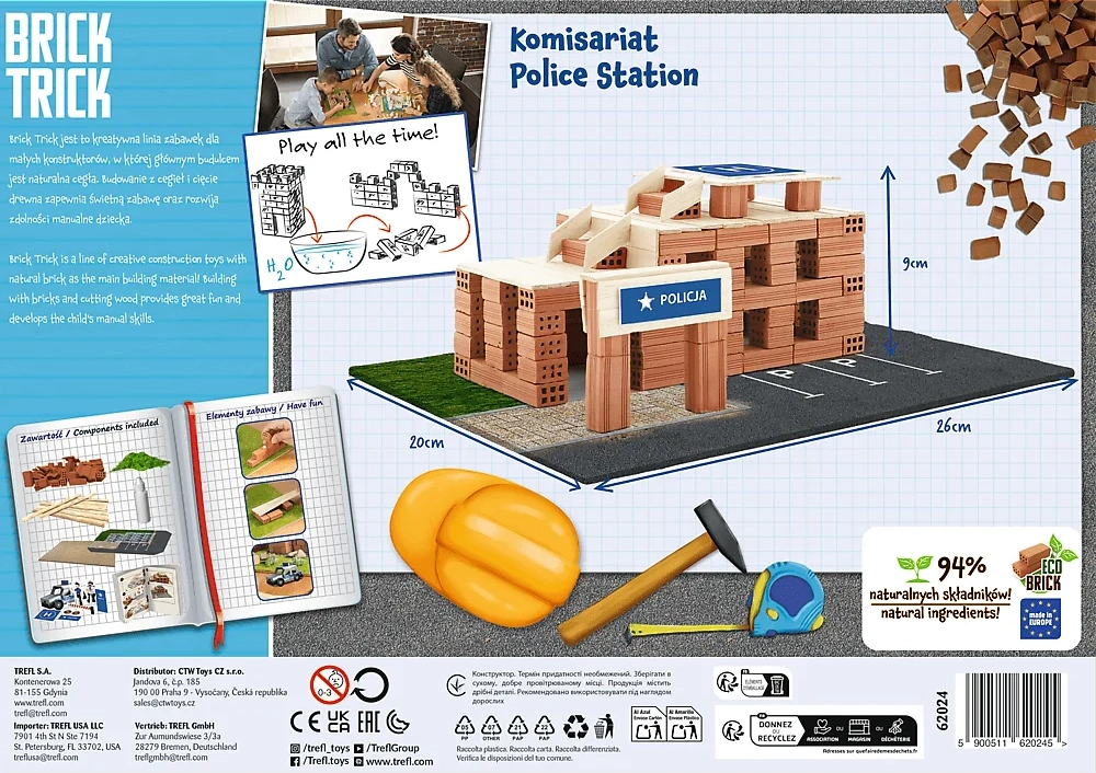 Постройте детайлно полицейско управление от истински глинени тухлички и дървени елементи. Сетът предлага автентично строително изживяване – тухла по тухла, рязане и лепене на летвички и финално декориране с включените украси и хартиени фигурки. Готовата постройка може лесно да се модифицира и разглобява благодарение на лепилото, което се разтваря във вода.
