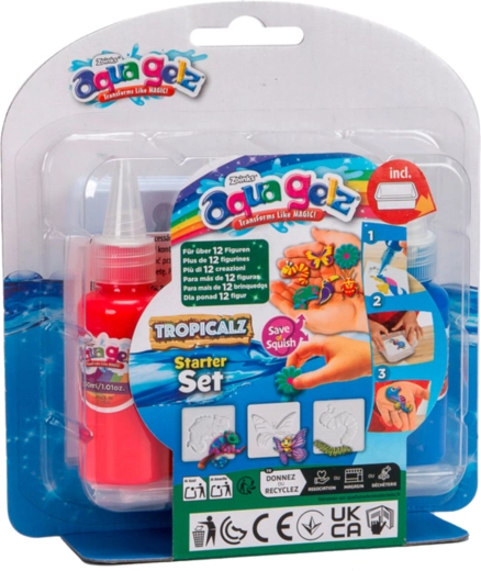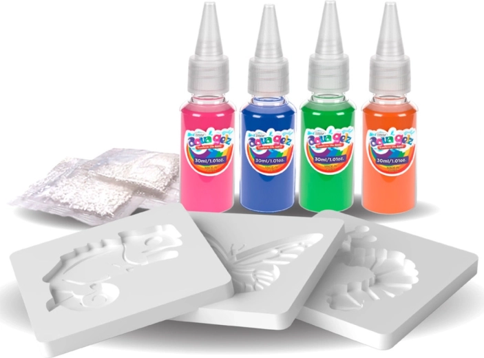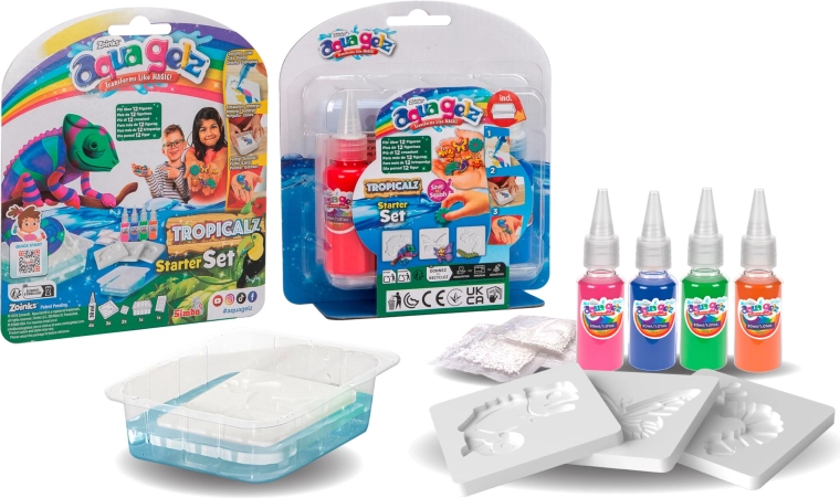 Открийте игривото творчество с AQUA GELZ – забавен комплект, с който децата лесно създават цветни гелови фигурки. Смесете специалния прах с вода, изберете форма, запълнете я с цветни гелове и потопете за кратко. За миг плоското изображение се превръща в мека 3D фигурка, която сама излиза от формата.