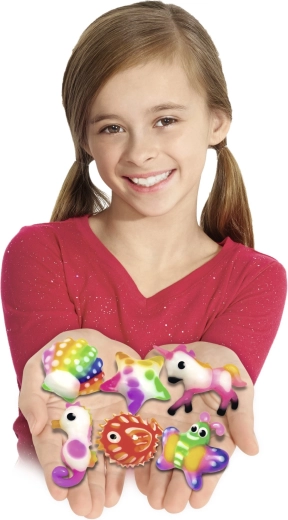 Смесете разтвора, запълнете формата с гел и потопете във вода – за миг се получава мека 3D фигурка, готова за игра.