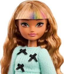 Практичните аксесоари – гребен, „лак за коса“, „машa“, телефон с калъф, звездна чанта и книжка – развиват въображението и фината моторика. Тоалетът с ментов пуловер с панделки, лъскава черна пола и анкъл ботуши е допълнен от реалистични детайли, които децата обичат.