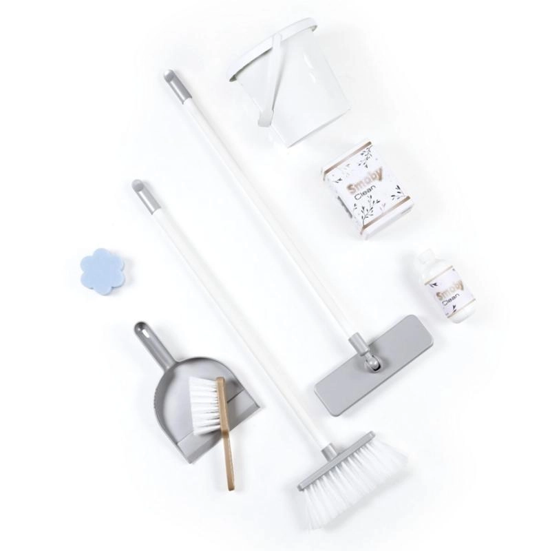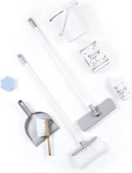 Включени са лопатка и метличка, моп, четка, кофа и макети на почистващи препарати – всичко за ролеви игри и развитие на фината моторика.